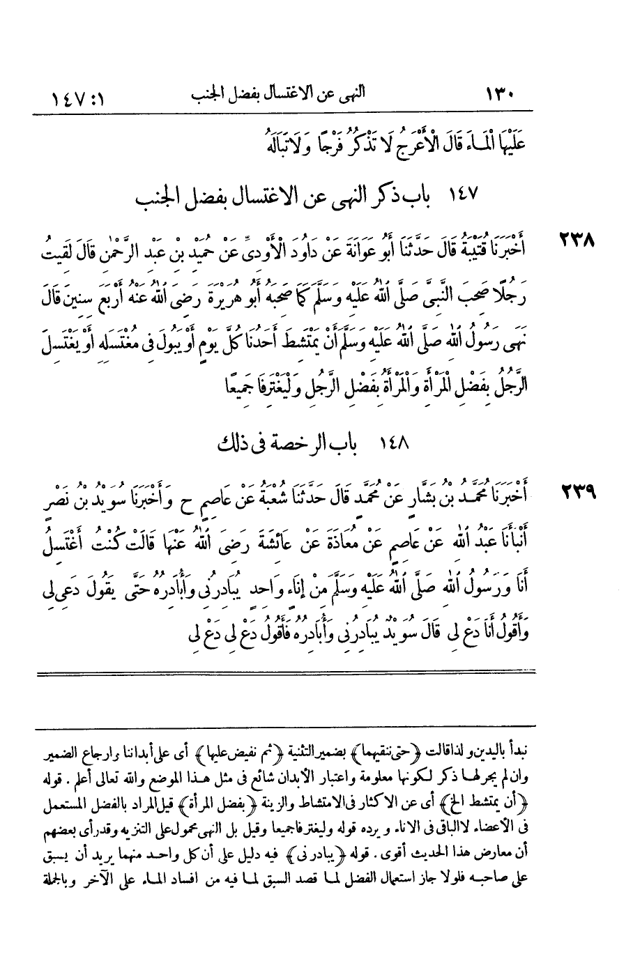 نبدأ باليدين وَلذَا قَالَت حَتَّى ننقيهما بضمير التَّثْنِيَة ثمَّ نفيض عَلَيْهَا أَي على أبداننا وارجاع الضَّمِير وان لم يجر لَهَا ذكر لكَونهَا مَعْلُومَة وَاعْتِبَار الْأَبدَان شَائِع فِي مثل هَذَا الْموضع وَالله تَعَالَى أعلم قَوْله أَن يمتشط الخ أَي عَن الْإِكْثَار فِي الامتشاط والزينة بِفضل الْمَرْأَة قيل المُرَاد بِالْفَضْلِ الْمُسْتَعْمل فِي الْأَعْضَاء لَا الْبَاقِي فِي الْإِنَاء وَيَردهُ قَوْله وليغترفا جَمِيعًا وَقيل بل النَّهْي مَحْمُول على التَّنْزِيه وَقد رأى بَعضهم أَن معَارض هَذَا الحَدِيث أقوى قَوْله يبادرني فِيهِ دَلِيل على أَن كل وَاحِد مِنْهُمَا يُرِيد أَن يسْبق على صَاحبه فلولا جَازَ اسْتِعْمَال الْفضل لما قصد السَّبق لما فِيهِ من افساد المَاء على الآخر وَبِالْجُمْلَةِ