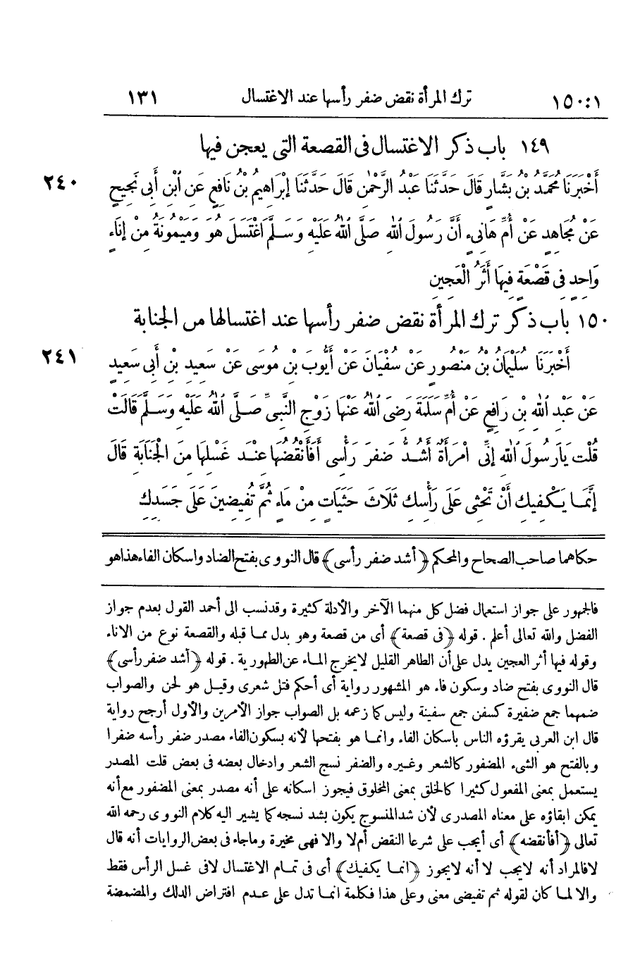 [251] أَنَّ امْرَأَةً سَأَلَتْ النَّبِيَّ صَلَّى اللَّهُ عَلَيْهِ وَسَلَّمَ عَنْ غُسْلِهَا مِنَ الْحَيْضِ هِيَ أَسْمَاءُ بِنْتُ شَكَلٍ وَقِيلَ أَسْمَاءُ بِنْتُ يَزِيدَ بْنِ السَّكَنِ فَأَخْبَرَهَا كَيْفَ تَغْتَسِلُ لَفْظُ مُسْلِمٍ فَقَالَ تَأْخُذُ إِحْدَاكُنَّ مَاءَهَا وَسِدْرَهَا فَتَطْهُرُ فَتُحْسِنُ الطَّهُورَ ثُمَّ تَصُبُّ عَلَى رَأْسِهَا فَتَدْلُكُهُ دَلْكًا شَدِيدًا حَتَّى تَبْلُغَ شُئُونَ رَأْسِهَا ثُمَّ تَصُبُّ عَلَيْهَا الْمَاءَ ثُمَّ تَأْخُذُ فِرْصَةً الْحَدِيثَ ثُمَّ قَالَ خذي فرْصَة بِكَسْر الْفَاء وَحكى بن سِيدَهْ تَثْلِيثَهَا وَبِإِسْكَانِ الرَّاءِ وَإِهْمَالِ الصَّادِ قِطْعَةٌ مِنْ صُوفٍ أَوْ قُطْنٍ أَوْ جِلْدَةٌ عَلَيْهَا صُوفٌ حَكَاهُ أَبُو عُبَيْدٍ وَغَيْرُهُ وَحَكَى أَبُو دَاوُدَ فِي رِوَايَةِ أَبِي الْأَحْوَصِ قَرْصَةً بِفَتْحِ الْقَافِ وَوَجَّهَهُ الْمُنْذِرِيُّ فَقَالَ يَعْنِي شَيْئًا يَسِيرًا مثل القرصة بِطرف الأصبعين وَقَالَ بن قُتَيْبَةَ هِيَ قُرْضَةُ بِضَمِّ الْقَافِ وَبِالضَّادِ الْمُعْجَمَةِ قَالَ وَقَوْلُهُ مِنْ مَسْكٍ بِفَتْحِ الْمِيمِ وَالْمُرَادُ قِطْعَةُ جِلْدٍ وَوَهِيَ مَنْ قَالَ بِكَسْرِ الْمِيمِ وَاحْتَجَّ بِأَنَّهُمْ كَانُوا فِي ضِيقٍ يَمْتَنِعُ مَعَهُ أَنْ يَمْتَهِنُوا الْمِسْكَ مَعَ غَلَاءِ ثَمَنِهِ وَتَبِعَهُ بن بَطَّالٍ وَفِي الْمَشَارِقِ أَنَّ أَكْثَرَ الرِّوَايَاتِ بِفَتْحِ الْمِيمِ وَرَجَّحَ النَّوَوِيُّ الْكَسْرَ وَأَنَّ الْمَقْصُودَ التَّطَيُّبُ وَدفع الرَّائِحَة الكريهة وَمَا استبعده بن قُتَيْبَة من
