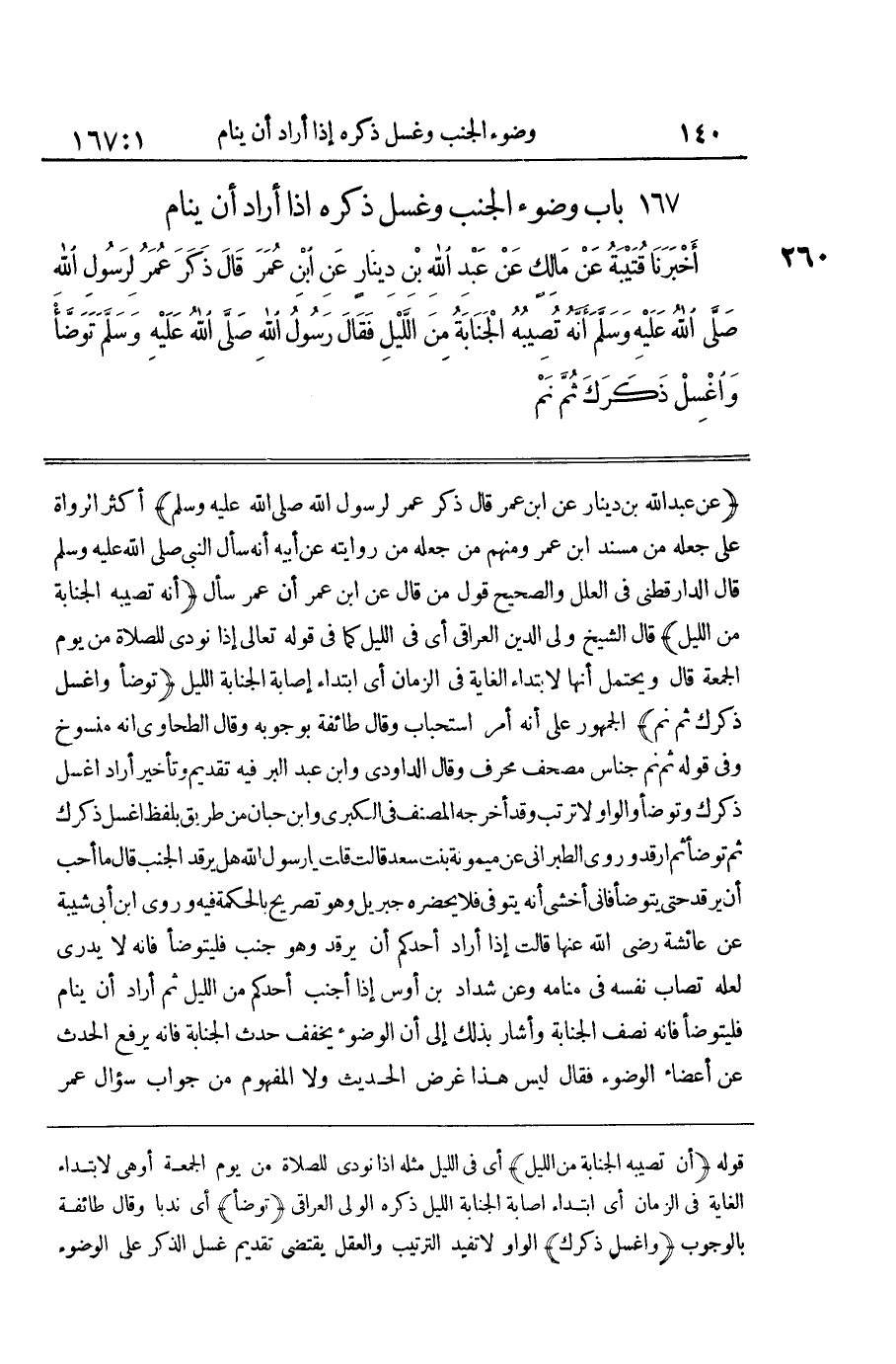 [260] عَن عبد الله بن دِينَار عَن بن عُمَرَ قَالَ ذَكَرَ عُمَرُ لِرَسُولِ اللَّهِ صَلَّى اللَّهُ عَلَيْهِ وَسَلَّمَ أَكْثَرُ الرُّوَاةِ عَلَى جَعْلِهِ من مُسْند بن عُمَرَ وَمِنْهُمْ مَنْ جَعَلَهُ مِنْ رِوَايَتِهِ عَنْ أَبِيهِ أَنَّهُ سَأَلَ النَّبِيَّ صَلَّى اللَّهُ عَلَيْهِ وَسَلَّمَ قَالَ الدَّارَقُطْنِيُّ فِي الْعِلَلِ وَالصَّحِيحُ قَوْلُ من قَالَ عَن بن عُمَرَ أَنَّ عُمَرَ سَأَلَ أَنَّهُ تُصِيبُهُ الْجَنَابَةُ مِنَ اللَّيْلِ قَالَ الشَّيْخُ وَلِيُّ الدِّينِ الْعِرَاقِيُّ أَيْ فِي اللَّيْلِ كَمَا فِي قَوْلِهِ تَعَالَى إِذا نُودي للصَّلَاة من يَوْم الْجُمُعَة قَالَ وَيَحْتَمِلُ أَنَّهَا لِابْتِدَاءِ الْغَايَةِ فِي الزَّمَان أَي ابْتِدَاء إِصَابَة الْجَنَابَة اللَّيْلِ تَوَضَّأْ وَاغْسِلْ ذَكَرَكَ ثُمَّ نَمْ الْجُمْهُورُ عَلَى أَنَّهُ أَمْرُ اسْتِحْبَابٍ وَقَالَ طَائِفَةٌ بِوُجُوبِهِ وَقَالَ الطَّحَاوِيُّ إِنَّهُ مَنْسُوخٌ وَفِي قَوْلِهِ ثُمَّ نم جناس مصحف محرف وَقَالَ الدَّاودِيّ وبن عَبْدِ الْبَرِّ فِيهِ تَقْدِيمٌ وَتَأْخِيرٌ أَرَادَ اغْسِلْ ذَكَرَكَ وَتَوَضَّأْ وَالْوَاوُ لَا تُرَتِّبُ وَقَدْ أَخْرَجَهُ المُصَنّف فِي الْكُبْرَى وبن حِبَّانَ مِنْ طَرِيقٍ بِلَفْظِ اغْسِلْ ذَكَرَكَ ثُمَّ تَوَضَّأْ ثُمَّ اُرْقُدْ وَرَوَى الطَّبَرَانِيُّ عَنْ مَيْمُونَةَ بِنْتِ سَعْدٍ قَالَتْ قُلْتُ يَا رَسُولَ اللَّهِ هَلْ يَرْقُدُ الْجُنُبُ قَالَ مَا أُحِبُّ أَنْ يَرْقُدَ حَتَّى يَتَوَضَّأَ فَإِنِّي أَخْشَى أَنَّهُ يُتَوَفَّى فَلَا يَحْضُرُهُ جِبْرِيلُ وَهُوَ تَصْرِيحٌ بِالْحِكْمَةِ فِيهِ وروى بن أَبِي شَيْبَةَ عَنْ عَائِشَةَ رَضِيَ اللَّهُ عَنْهَا قَالَتْ إِذَا أَرَادَ أَحَدُكُمْ أَنْ يَرْقُدَ وَهُوَ جُنُبٌ فَلْيَتَوَضَّأْ فَإِنَّهُ لَا يَدْرِي لَعَلَّهُ تُصَابُ نَفْسُهُ فِي مَنَامِهِ وَعَنْ شَدَّادِ بْنِ أَوْسٍ إِذَا أَجْنَبَ أَحَدُكُمْ مِنَ اللَّيْلِ ثمَّ أَرَادَ أَنْ يَنَامَ فَلْيَتَوَضَّأْ فَإِنَّهُ نِصْفُ الْجَنَابَةِ وَأَشَارَ بِذَلِكَ إِلَى أَنَّ الْوُضُوءَ يُخَفِّفُ حَدَثَ الْجَنَابَةِ فَإِنَّهُ يَرْفَعُ الْحَدَثَ عَنْ أَعْضَاءِ الْوُضُوءِ فَقَالَ لَيْسَ هَذَا غَرَضُ الْحَدِيثِ وَلَا الْمَفْهُومُ مِنْ جَوَاب سُؤال عمر