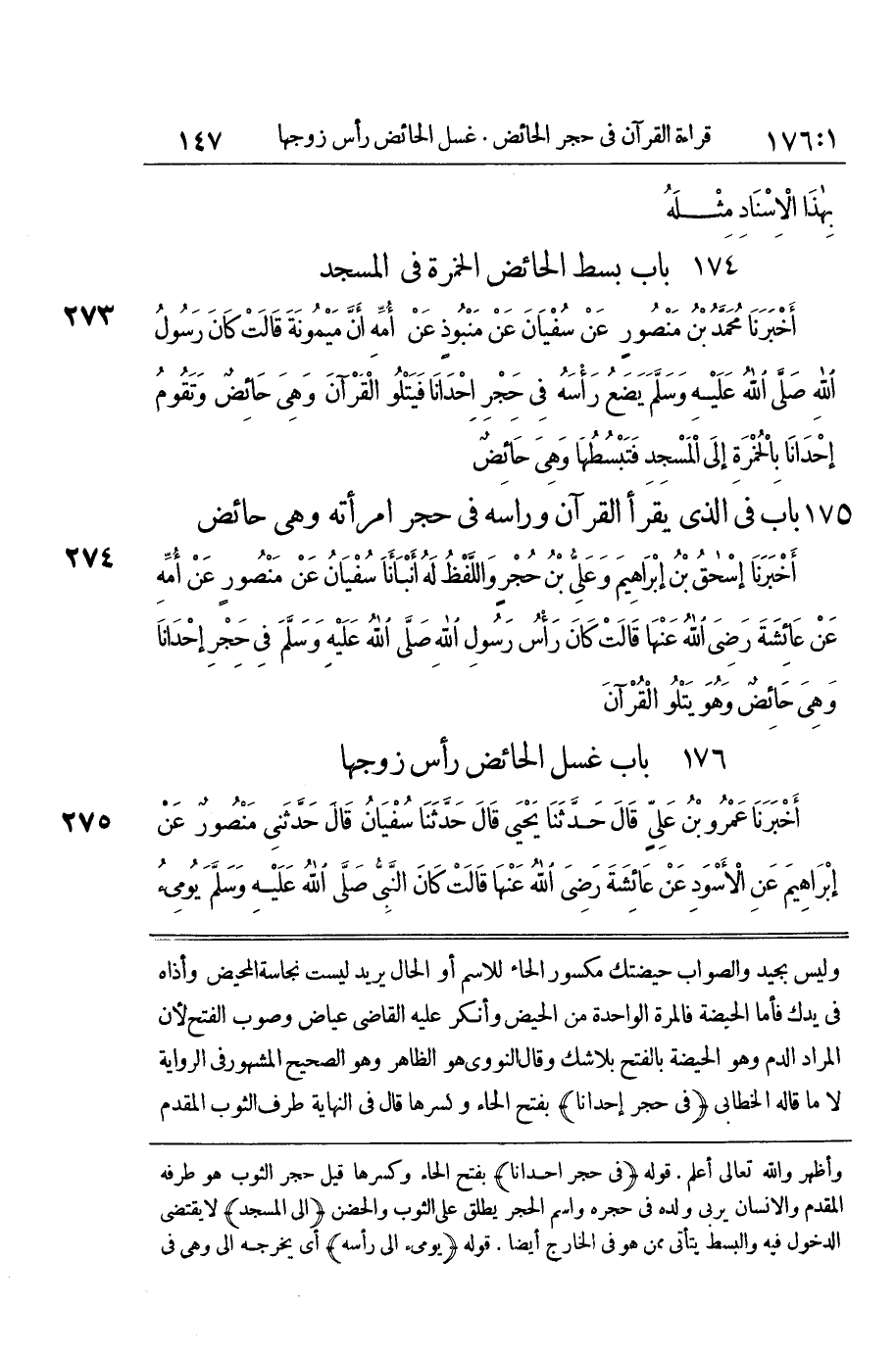 [283] بَيْنَمَا أَنَا مُضْطَجِعَةٌ بِالرَّفْعِ وَيَجُوزُ النَّصْبُ فِي الْخَمِيلَةِ هِيَ الْقَطِيفَةُ وَكُلُّ ثَوْبٍ لَهُ خَمْلٌ مِنْ أَيٍّ كَانَ فَأَخَذْتُ ثِيَابَ حَيْضَتِي قَالَ الْحَافِظ بن حَجَرٍ رُوِيَ بِالْفَتْحِ وَالْكَسْرِ وَجَزَمَ الْخَطَّابِيُّ بِالْكَسْرِ وَرَجَّحَهُ النَّوَوِيُّ وَرَجَّحَ الْقُرْطُبِيُّ الْفَتْحَ لِوُرُودِهِ فِي بَعْضِ طُرُقِهِ بِلَفْظِ حَيْضِي بِغَيْرِ تَاءٍ وَمَعْنَى الْفَتْحِ أَخَذْتُ ثِيَابِي الَّتِي أَلْبَسُهَا وَمَعْنَى الْكَسْرِ أَخَذْتُ ثِيَابِي الَّتِي أَعْدَدْتُهَا لِأَلْبَسَهَا حَالَةَ الْحَيْضِ فَقَالَ رَسُولُ اللَّهِ صَلَّى اللَّهُ عَلَيْهِ وَسَلَّمَ أَنَفِسْتِ قَالَ الْخَطَّابِيُّ هُوَ بِفَتْحِ النُّونِ وَكَسْرِ الْفَاءِ لِأَنَّ مَعْنَاهُ أَحِضْتِ يُقَالُ نَفِسَتِ الْمَرْأَةُ إِذَا حَاضَتْ وَنُفِسَتْ بِضَمِّ النُّونِ مِنَ النِّفَاسِ قَالَ الْحَافِظ بن حَجَرٍ وَهَذَا قَوْلُ كَثِيرٍ مِنْ أَهْلِ اللُّغَةِ لَكِنْ حَكَى أَبُو حَاتِمٍ عَنِ الْأَصْمَعِيِّ أَنْ يُقَالَ نُفِسَتِ الْمَرْأَةُ فِي الْحَيْضِ وَالْوِلَادَةِ بِضَمِّ النُّونِ فِيهِمَا قَالَ وَقَدْ ثَبَتَ فِي رِوَايَتِنَا بِالْوَجْهَيْنِ فَتْحُ النُّونِ وَضَمُّهَا