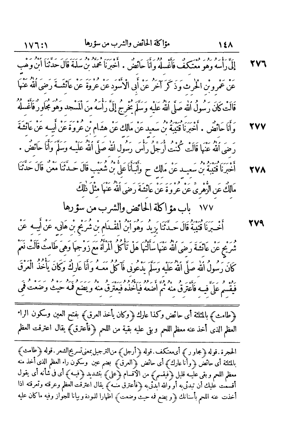 طَامِثٌ بِالْمُثَلَّثَةِ أَيْ حَائِضٌ وَكَذَا عَارِكٌ وَكَانَ يَأْخُذُ الْعَرْقَ بِفَتْحِ الْعَيْنِ وَسُكُونِ الرَّاءِ الْعَظْمُ الَّذِي أُخِذَ عَنْهُ مُعْظَمُ اللَّحْمِ وَبَقِيَ عَلَيْهِ بَقِيَّةٌ مِنَ اللَّحْمِ فَأَعْتَرِقُ يُقَالُ اعْتَرَقْتَ الْعَظْمَ وَعَرَّقْتَهُ وَتَعَرَّقْتَهُ إِذَا أَخَذْتَ عَنْهُ اللَّحْمَّ بِأَسْنَانِكَ