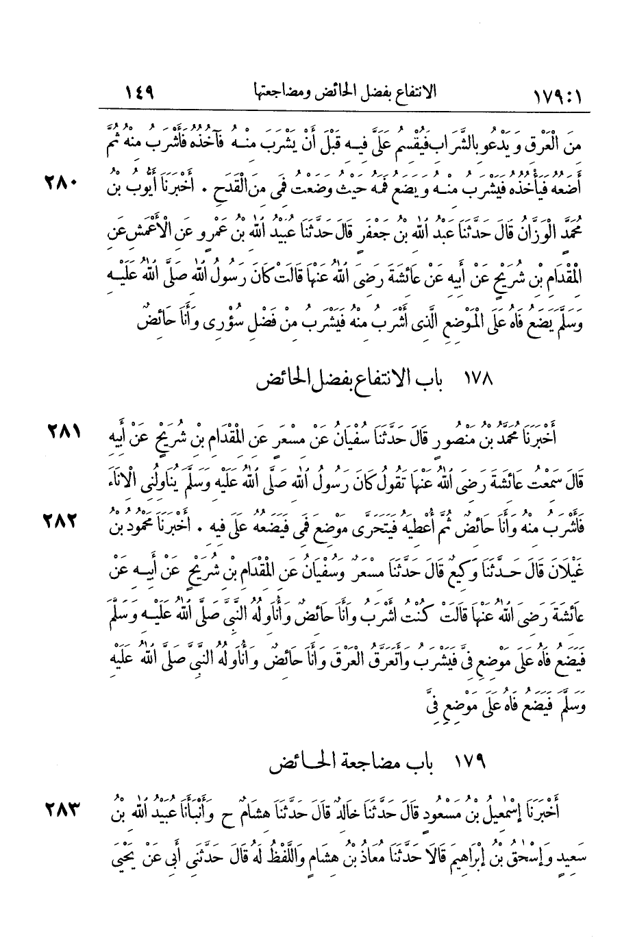 280 - أَخْبَرَنَا أَيُّوبُ بْنُ مُحَمَّدٍ الْوَزَّانُ قَالَ: حَدَّثَنَا عَبْدُ اللَّهِ بْنُ جَعْفَرٍ قَالَ: حَدَّثَنَا عُبَيْدُ اللَّهِ بْنُ عَمْرٍو، عَنِ الْأَعْمَشِ، عَنِ الْمِقْدَامِ بْنِ شُرَيْحٍ، عَنْ أَبِيهِ، عَنْ عَائِشَةَ رَضِيَ اللَّهُ عَنْهَا قَالَتْ: «كَانَ رَسُولُ اللَّهِ صَلَّى اللهُ عَلَيْهِ وَسَلَّمَ §يَضَعُ فَاهُ عَلَى الْمَوْضِعِ الَّذِي أَشْرَبُ مِنْهُ فَيَشْرَبُ مِنْ فَضْلِ سُؤْرِي، وَأَنَا حَائِضٌ»