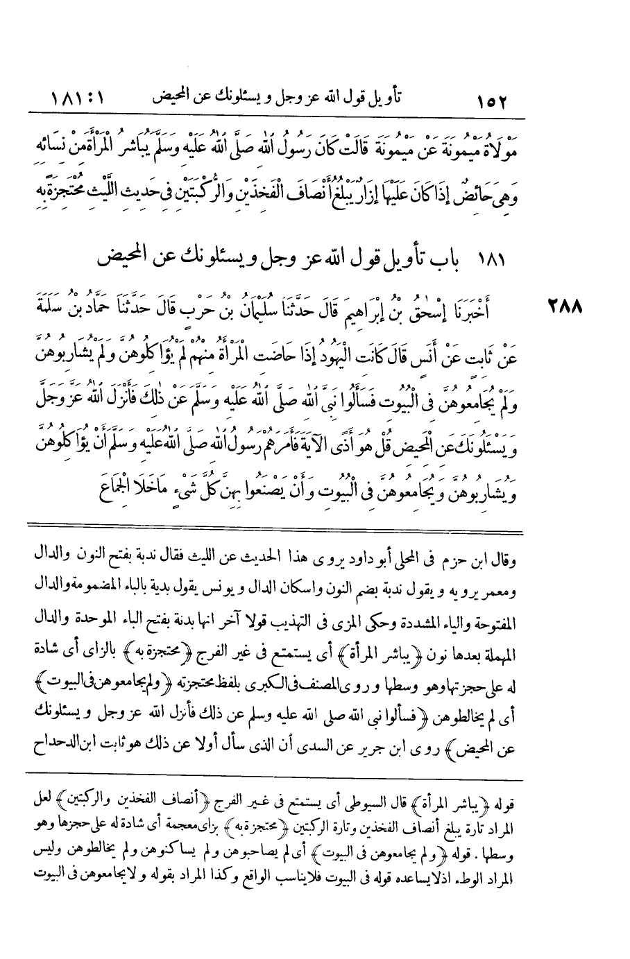 [288] وَلَمْ يُجَامِعُوهُنَّ فِي الْبُيُوتِ أَيْ لَمْ يُخَالِطُوهُنَّ فَسَأَلُوا نَبِيَّ اللَّهِ صَلَّى اللَّهُ عَلَيْهِ وَسَلَّمَ عَن ذَلِك فَأنْزل الله عز وَجل ويسئلونك عَن الْمَحِيض روى بن جَرِيرٍ عَنِ السُّدِّيِّ أَنَّ الَّذِي سَأَلَ أَوَّلًا عَن ذَلِك هُوَ ثَابت بن الدحداح حُتِّيهِ بِالْمُثَنَّاةِ أَيْ حُكِّيهِ ثُمَّ اُقْرُصِيهِ بِالصَّادِ الْمُهْمَلَةِ قَالَ فِي النِّهَايَةِ الْقَرْصُ الدَّلْكُ بِأَطْرَافِ الْأَصَابِعِ وَالْأَظْفَارِ مَعَ صَبِّ الْمَاءِ عَلَيْهِ حَتَّى يذهب أَثَره