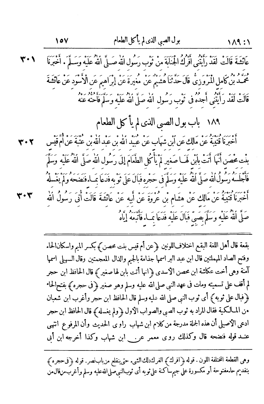 [302] عَنْ أُمِّ قَيْسٍ بِنْتِ مِحْصَنٍ بِكَسْرِ الْمِيمِ واسكان الْحَاء وَفتح الصَّاد الْمُهْمَلَتَيْنِ قَالَ بن عَبْدِ الْبَرِّ اسْمُهُا جُذَامَةُ بِالْجِيمِ وَالذَّالِ الْمُعْجَمَتَيْنِ وَقَالَ السُّهَيْلِيُّ اسْمُهُا آمِنَةُ وَهِيَ أُخْتُ عُكَّاشَةَ بْنِ مِحْصَنٍ الْأَسَدِيِّ أَنَّهَا أَتَتْ بِابْنٍ لَهَا صَغِير قَالَ الْحَافِظ بن حَجَرٍ لَمْ أَقِفْ عَلَى تَسْمِيَتِهِ وَمَاتَ فِي عَهْدِ النَّبِيِّ صَلَّى اللَّهُ عَلَيْهِ وَسَلَّمَ وَهُوَ صَغِيرٌ فِي حَجْرِهِ بِفَتْحِ الْحَاءِ