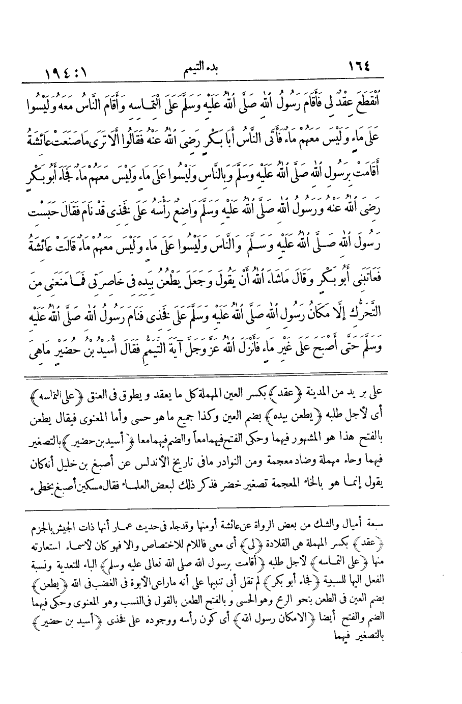 عَلَى بَرِيدٍ مِنَ الْمَدِينَةِ عِقْدٌ بِكَسْرِ الْعَيْنِ الْمُهْمَلَةِ كُلُّ مَا يُعْقَدُ وَيُطُوَّقُ فِي الْعُنُقِ عَلَى الْتِمَاسِهِ أَيْ لِأَجْلِ طَلَبِهِ يَطْعُنُ بِيَدِهِ بِضَمِّ الْعَيْنِ وَكَذَا جَمِيعُ مَا هُوَ حِسِّيٌ وَأما الْمَعْنَوِيّ فَيُقَال يطعن بِالْفَتْح هَذَا هُوَ الْمَشْهُورِ فِيهِمَا وَحُكِيَ الْفَتْحُ فِيهِمَا مَعًا وَالضَّمُ فيهمَا مَعًا أسيد بْنُ حُضَيْرٍ بِالتَّصْغِيرِ فِيهِمَا وَحَاءٍ مُهْمَلَةٍ وَضَادٍ مُعْجَمَةٍ وَمِنَ النَّوَادِرِ مَا فِي تَارِيخِ الْأَنْدَلُسِ عَنْ أَصْبَغَ بْنِ خَلِيلٍ أَنَّهُ كَانَ يَقُولُ إِنِّمَا هُوَ بِالْخَاءِ الْمُعْجَمَةِ تَصْغِيرُ خِضْرٍ فَذُكِرَ ذَلِك لبَعض الْعلمَاء فَقَالَ مِسْكين أصبغ يخطىء