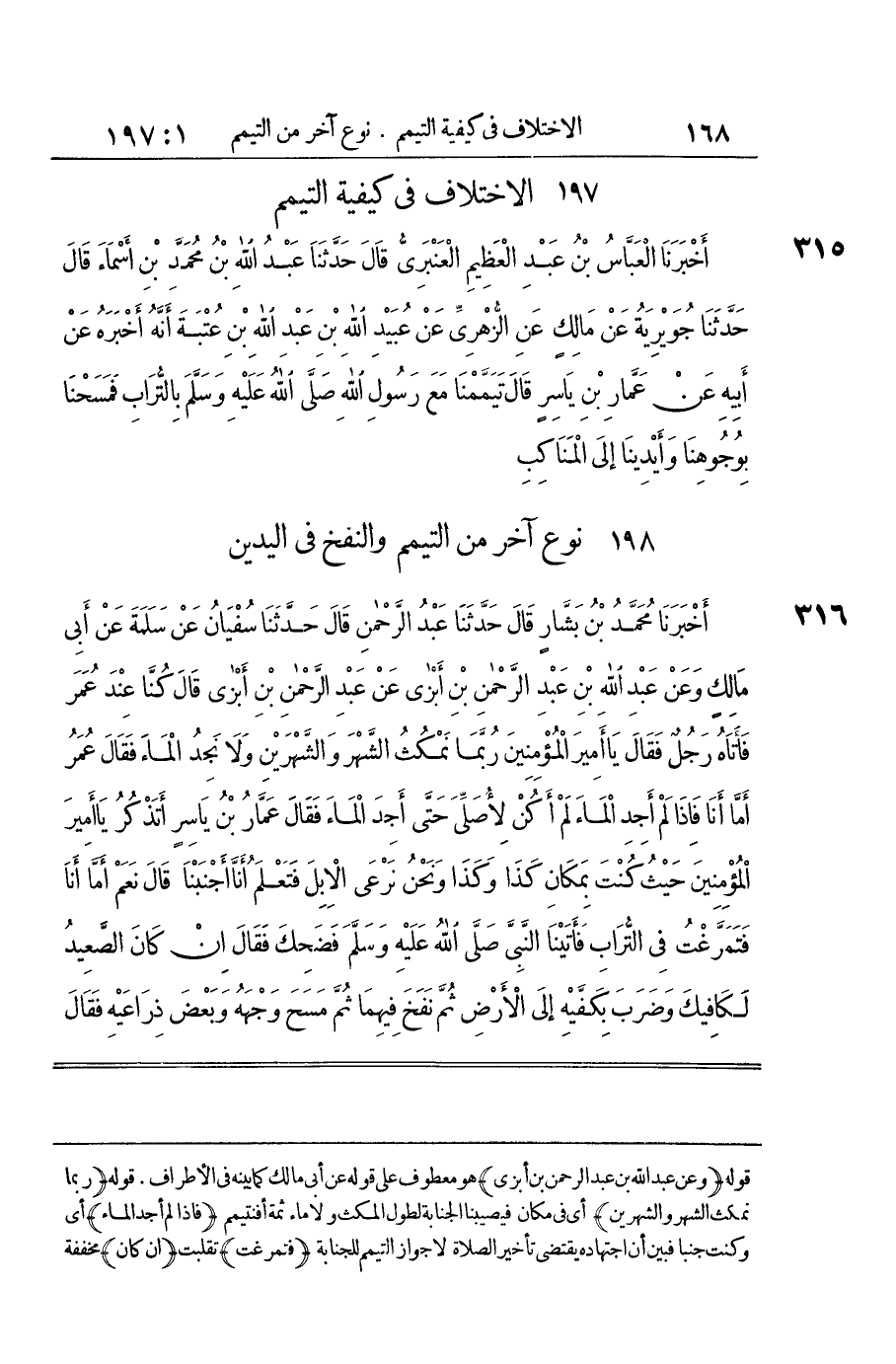 [316] وَعَنْ عَبْدِ اللَّهِ بْنِ عَبْدِ الرَّحْمَنِ بْنِ أَبْزَى هُوَ مَعْطُوف على قَوْله عَن أبي مَالك كَمَا بَينه فِي الْأَطْرَاف قَوْله رُبمَا نمكث الشَّهْر والشهرين أَي فِي مَكَان فيصيبنا الْجَنَابَة لطول الْمكْث وَلَا مَاء ثمَّة أفنتيمم فَإِذا لم أجد المَاء أَي وَكنت جنبا فَبين أَن اجْتِهَاده يَقْتَضِي تَأْخِير الصَّلَاة لَا جَوَاز التَّيَمُّم للجنابة فتمرغت تقلبت أَن كَانَ مُخَفّفَة