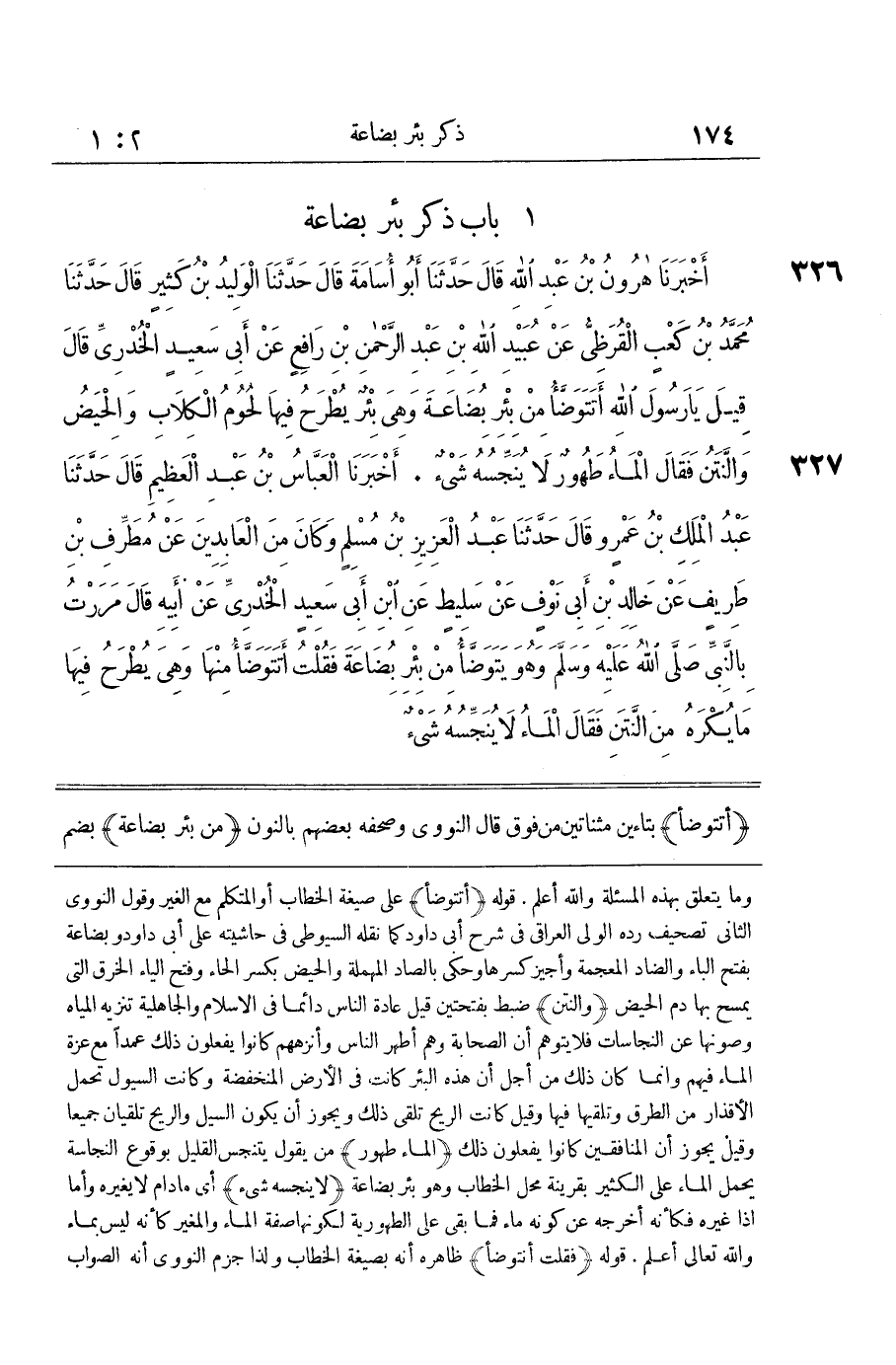 أَتَتَوَضَّأُ بِتَاءَيْنِ مُثَّنَاتَيْنِ مِنْ فَوْقَ قَالَ النَّوَوِيُّ وَصَحَّفَهُ بَعْضُهُمْ بِالنُّونِ مِنْ بِئْرِ بُضَاعَةَ بِضَمِّ