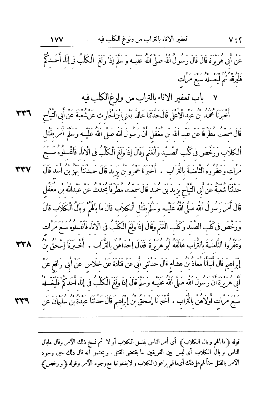 [337] مَا بالهم وبال الْكلاب أَي أَمر النَّاس بقتل الْكلاب أَولا ثمَّ نسخ ذَلِك الْأَمر وَقَالَ مَا بَال النَّاس وبال الْكلاب أَي لَيْسَ بَين الْفَرِيقَيْنِ مَا يَقْتَضِي الْقَتْل وَيحْتَمل أَنه قَالَ ذَلِك حِين وجود الْأَمر بِالْقَتْلِ حثا لَهُم على ذَلِك أَي مَا لَهُم يراعون الْكلاب وَلَا يقتلونها مَعَ وجود الْأَمر وَقَوله وَرخّص أَي فِي اقتنائه أَو عدم قَتله قَوْله