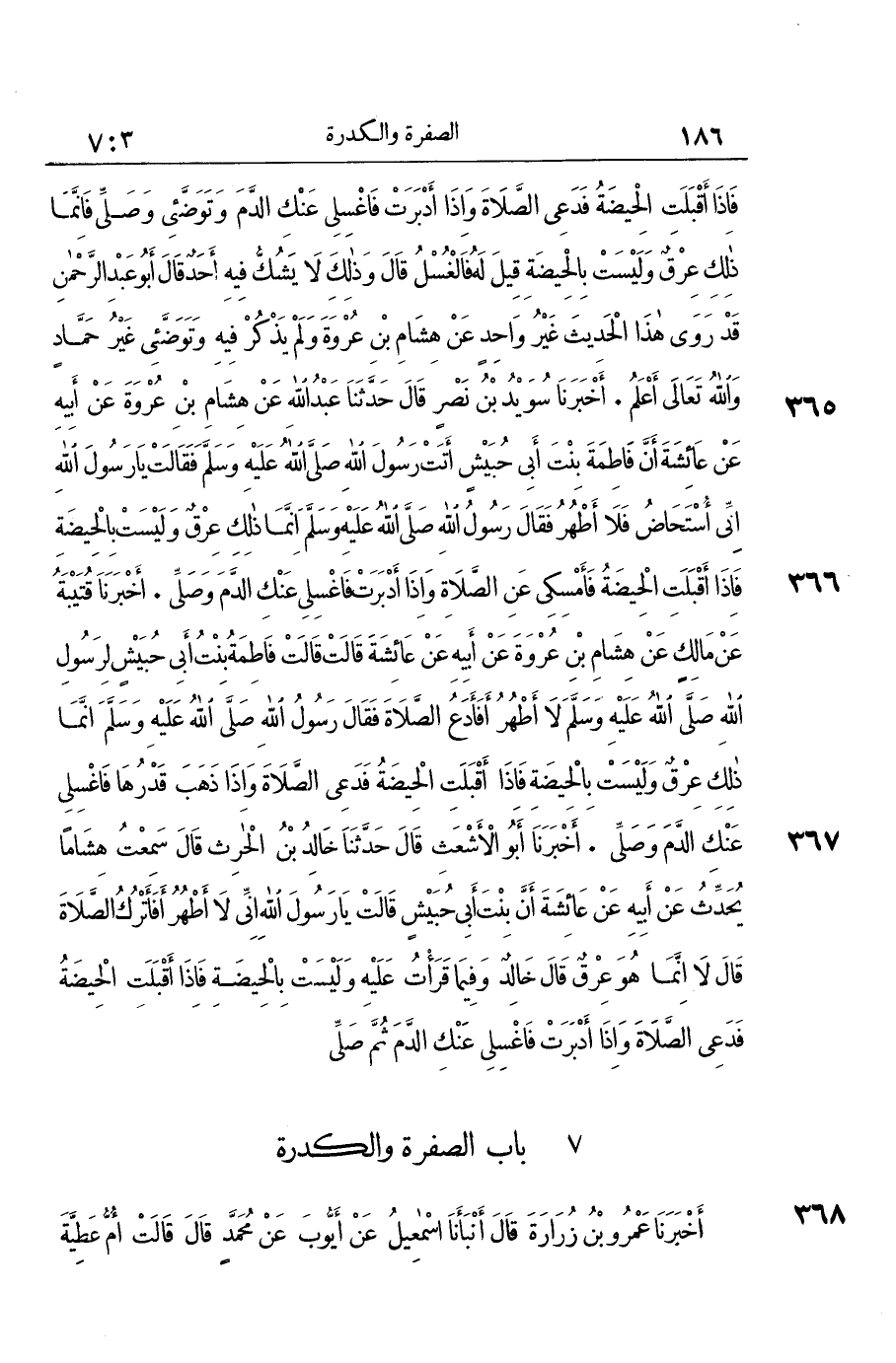 367 - أَخْبَرَنَا أَبُو الْأَشْعَثِ قَالَ: حَدَّثَنَا خَالِدُ بْنُ الْحَارِثِ قَالَ: سَمِعْتُ هِشَامًا يُحَدِّثُ، عَنْ أَبِيهِ، عَنْ عَائِشَةَ، أَنَّ بِنْتَ أَبِي حُبَيْشٍ قَالَتْ: يَا رَسُولَ اللَّهِ، إِنِّي §لَا أَطْهُرُ أَفَأَتْرُكُ الصَّلَاةَ؟ قَالَ: «لَا. إِنَّمَا هُوَ عِرْقٌ» قَالَ خَالِدٌ: وَفِيمَا قَرَأْتُ عَلَيْهِ «وَليْسَتْ بِالْحَيْضَةِ، فَإِذَا أَقْبَلَتِ الْحَيْضَةُ فَدَعِي الصَّلَاةَ، وَإِذَا أَدْبَرَتْ فَاغْسِلِي عَنْكِ الدَّمَ، ثُمَّ صلِّي»