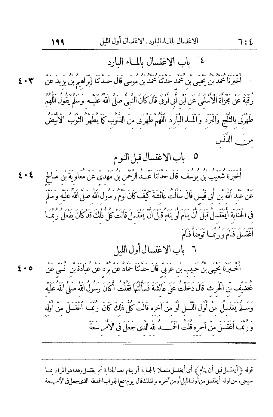 [404] أيغتسل قبل أَن ينَام أَي أيغتسل مُتَّصِلا بالجنابة أَو ينَام بعد الْجَنَابَة ثمَّ يغْتَسل وَهَذَا هُوَ المُرَاد بِمَا سَيَجِيءُ من قَوْله أيغتسل من أول اللَّيْل أَو من آخِره وَلذَلِك قَالَ يَوْم سمع الْجَواب الْحَمْدُ لِلَّهِ الَّذِي جَعَلَ فِي الْأَمْرِ سَعَةً