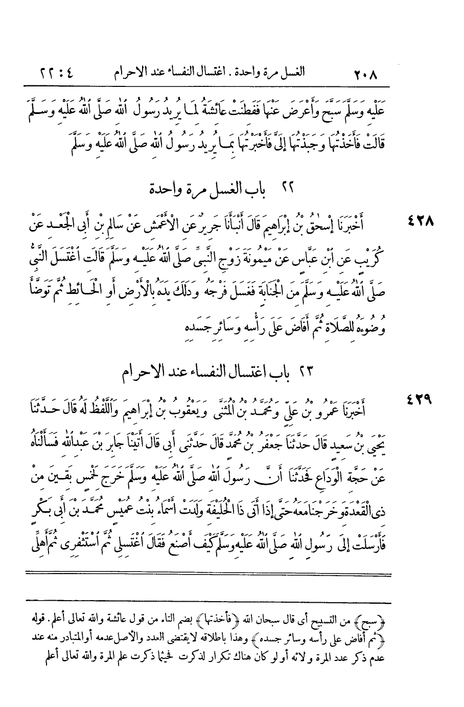 [428] ثمَّ أَفَاضَ على رَأسه وَسَائِر جسده وَهَذَا بِإِطْلَاقِهِ لَا يَقْتَضِي الْعدَد وَالْأَصْل عَدمه أَو الْمُتَبَادر مِنْهُ عِنْد عدم ذكر عدد الْمرة ولائه أَو لَو كَانَ هُنَاكَ تكْرَار لذكرت فَحَيْثُمَا ذكرت علم الْمرة وَالله تَعَالَى أعلم قَوْله