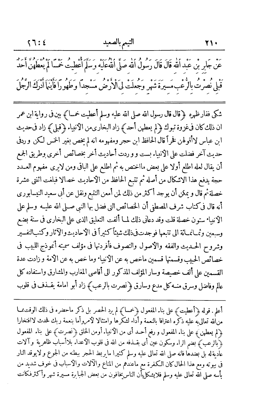 شكى فَقَارَ ظَهْرِهِ قَالَ قَالَ رَسُولُ اللَّهِ صَلَّى اللَّهُ عَلَيْهِ وَسَلَّمَ أُعْطِيتُ خَمْسًا بَيَّنَ فِي رِوَايَة بن عُمَرَ أَنَّ ذَلِكَ كَانَ فِي غَزْوَةِ تَبُوكَ لَمْ يُعْطَهُنَّ أَحَدٌ زَادَ الْبُخَارِيُّ مِنَ الْأَنْبِيَاءِ قبلي زَاد فِي حَدِيث بن عَبَّاس لَا أقولهن فخرا قَالَ الْحَافِظ بن حَجَرٍ وَمَفْهُومُهُ أَنَّهُ لَمْ يُخَصَّ بِغَيْرِ الْخَمْسِ لَكِنْ وَرَدَ فِي حَدِيثٍ آخَرَ فُضِّلْتُ عَلَى الْأَنْبِيَاءِ بِسِتٍّ وَوَرَدَتْ أَحَادِيثُ أُخَرُ بِخَصَائِصَ أُخْرَى وَطَرِيقُ الْجَمْعِ أَنْ يُقَالَ لَعَلَّهُ اطَّلَعَ أَوَّلًا عَلَى بَعْضِ مَا اخْتُصَّ بِهِ ثُمَّ اطَّلَعَ عَلَى الْبَاقِي وَمَنْ لَا يَرَى مَفْهُومَ الْعَدَدِ حُجَّةً يَدْفَعُ هَذَا الْإِشْكَالِ مِنْ أَصْلِهِ ثُمَّ تَتَبَّعَ الْحافِظُ مِنَ الْأَحَادِيثِ خِصَالًا فَبَلَغَتِ اثْنَتَيْ عَشْرَةَ خَصْلَةً ثُمَّ قَالَ وَيُمْكِنُ أَنْ يُوجَدَ أَكْثَرُ مِنْ ذَلِكَ لِمَنْ أَمْعَنَ التَّتَبُّعَ وَنُقِلَ عَنْ أَبِي سَعِيدٍ النَّيْسَابُورِيِّ أَنَّهُ قَالَ فِي كِتَابِ شَرَفِ الْمُصْطَفَى إِنَّ الْخَصَائِصَ الَّتِي فُضِّلَ بِهَا النَّبِيُّ صَلَّى اللَّهُ عَلَيْهِ وَسَلَّمَ عَلَى الْأَنْبِيَاءِ سِتُّونَ خَصْلَةً قُلْتُ وَقَدْ دَعَانِي ذَلِكَ لَمَّا أَلَّفْتُ التَّعْلِيقَ الَّذِي عَلَى الْبُخَارِيِّ فِي سَنَةِ بِضْعٍ وَسَبْعِينَ وَثَمَانِمِائَةِ إِلَى تَتَبُّعِهَا فَوَجَدْتُ فِي ذَلِكَ شَيْئًا كَثِيرًا فِي الْأَحَادِيثِ وَالْآثَارِ وَكُتُبِ التَّفْسِيرِ وَشُرُوحِ الْحَدِيثِ وَالْفِقْهِ وَالْأُصُولِ وَالتَّصَوُّفِ فَأَفْرَدْتُهَا فِي مُؤَلَّفٍ سَمَّيْتُهُ أُنْمُوذَجُ اللَّبِيبِ فِي خَصَائِصِ الْحَبِيبِ وَقَسَّمْتُهَا قِسْمَيْنِ مَا خُصَّ بِهِ عَنِ الْأَنْبِيَاءِ وَمَا خُصَّ بِهِ عَنِ الْأُمَّةِ وَزَادَتْ عِدَّةُ الْقِسْمَيْنِ عَلَى أَلْفِ خِصِّيصَةٍ وَسَارَ الْمُؤَلَّفُ الْمَذْكُورُ إِلَى أَقَاصِي الْمَغَارِبِ وَالْمَشَارِقِ وَاسْتَفَادَهُ كُلُّ عَالِمٍ وَفَاضِلٍ وَسَرَقَ مِنْهُ كُلَّ مُدَّعٍ وَسَارِقٍ نُصِرْتُ بِالرُّعْبِ زَادَ أَبُو أُمَامَةَ يُقْذَفُ فِي قُلُوب