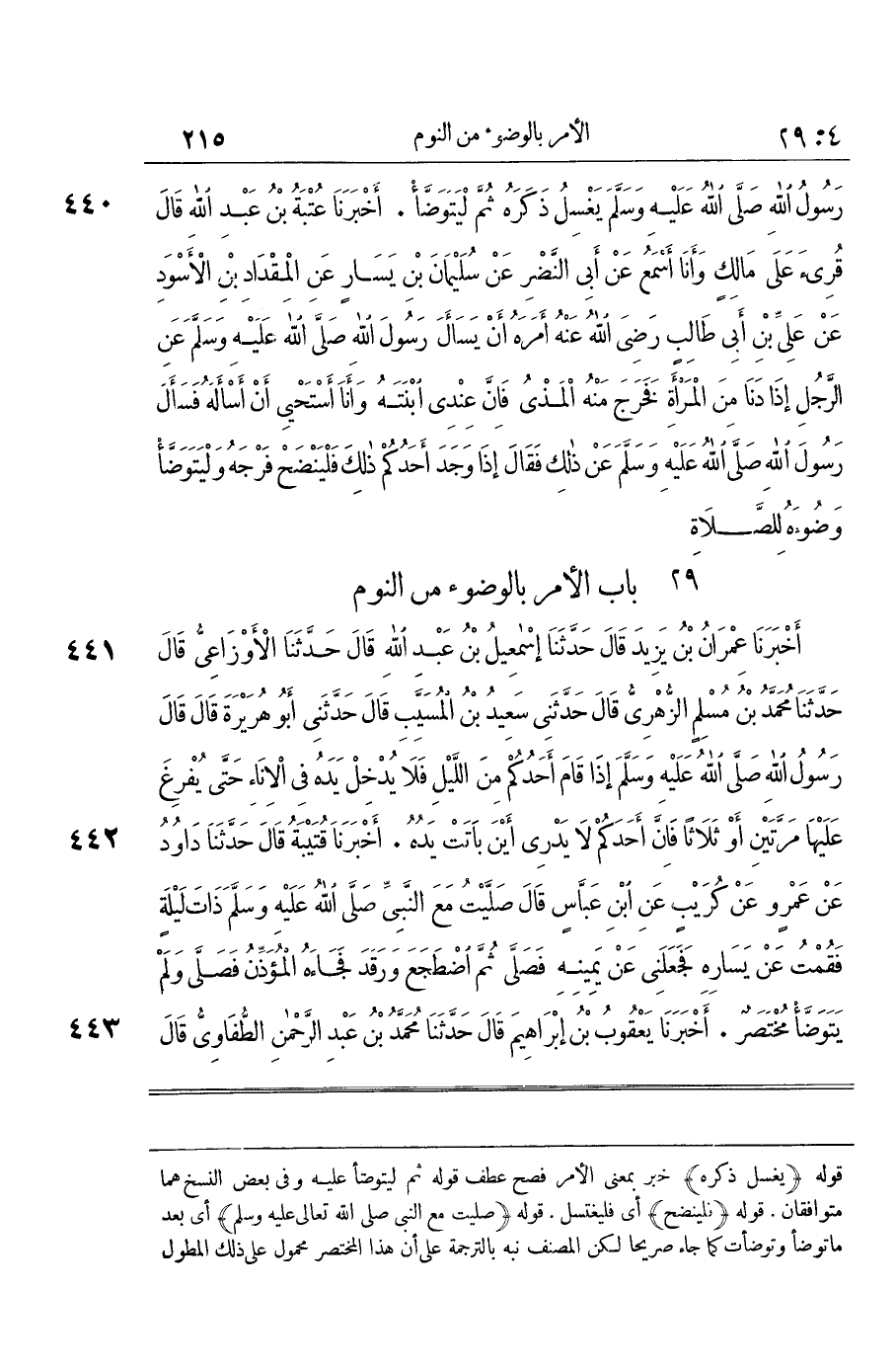 [442] صليت مَعَ النَّبِي صلى الله تَعَالَى عَلَيْهِ وَسلم أَي بعد مَا تَوَضَّأ وتوضأت كَمَا جَاءَ صَرِيحًا لَكِن المُصَنّف نبه بالترجمة على أَن هَذَا الْمُخْتَصر مَحْمُول على ذَلِك المطول قَوْله نعس بِفتْحَتَيْنِ وَعلم أَن النعاس لَا ينْقض الْوضُوء وَقد سبق تَقْرِيره قَوْله