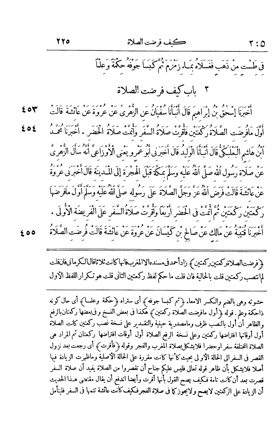 [455] فُرِضَتِ الصَّلَاةُ رَكْعَتَيْنِ رَكْعَتَيْنِ زَادَ أَحْمَدُ فِي مُسْنَدِهِ إِلَّا الْمَغْرِبَ فَإِنَّهَا كَانَتْ ثَلَاثًا قَالَ الْكَرْمَانِيُّ فَإِنْ قُلْتَ لِمَ انْتَصَبَ رَكْعَتَيْنِ قُلْتُ بِالْحَالِيَّةِ فَإِنْ قُلْتَ مَا حُكْمُ لَفْظِ رَكْعَتَيْنِ الثَّانِي قُلْتُ هُوَ تَكْرَارُ اللَّفْظِ الْأَوَّلِ وَهُمَا بِالْحَقِيقَةِ عِبَارَةٌ عَنْ كَلِمَةٍ وَاحِدَةٍ نَحْوَ مَثْنَى وَذَلِكَ كَالْحُلْوِ الْحَامِضِ الْقَائِمِ مَقَامَ الْمِزِّ فَأُقِرَّتْ صَلَاةُ السَّفَرِ وَزِيدَ فِي صَلَاةِ الْحَضَرِ فِي رِوَايَة بن خُزَيْمَة وبن حِبَّانَ فَلَمَّا قَدِمَ رَسُولُ اللَّهِ صَلَّى اللَّهُ عَلَيْهِ وَسَلَّمَ الْمَدِينَةَ زِيدَ فِي صَلَاةِ الْحَضَرِ رَكْعَتَانِ تُرِكَتْ صَلَاةُ الْفَجْرِ لِطُولِ الْقِرَاءَةِ وَصَلَاةُ الْمغرب لِأَنَّهَا وتر النَّهَار