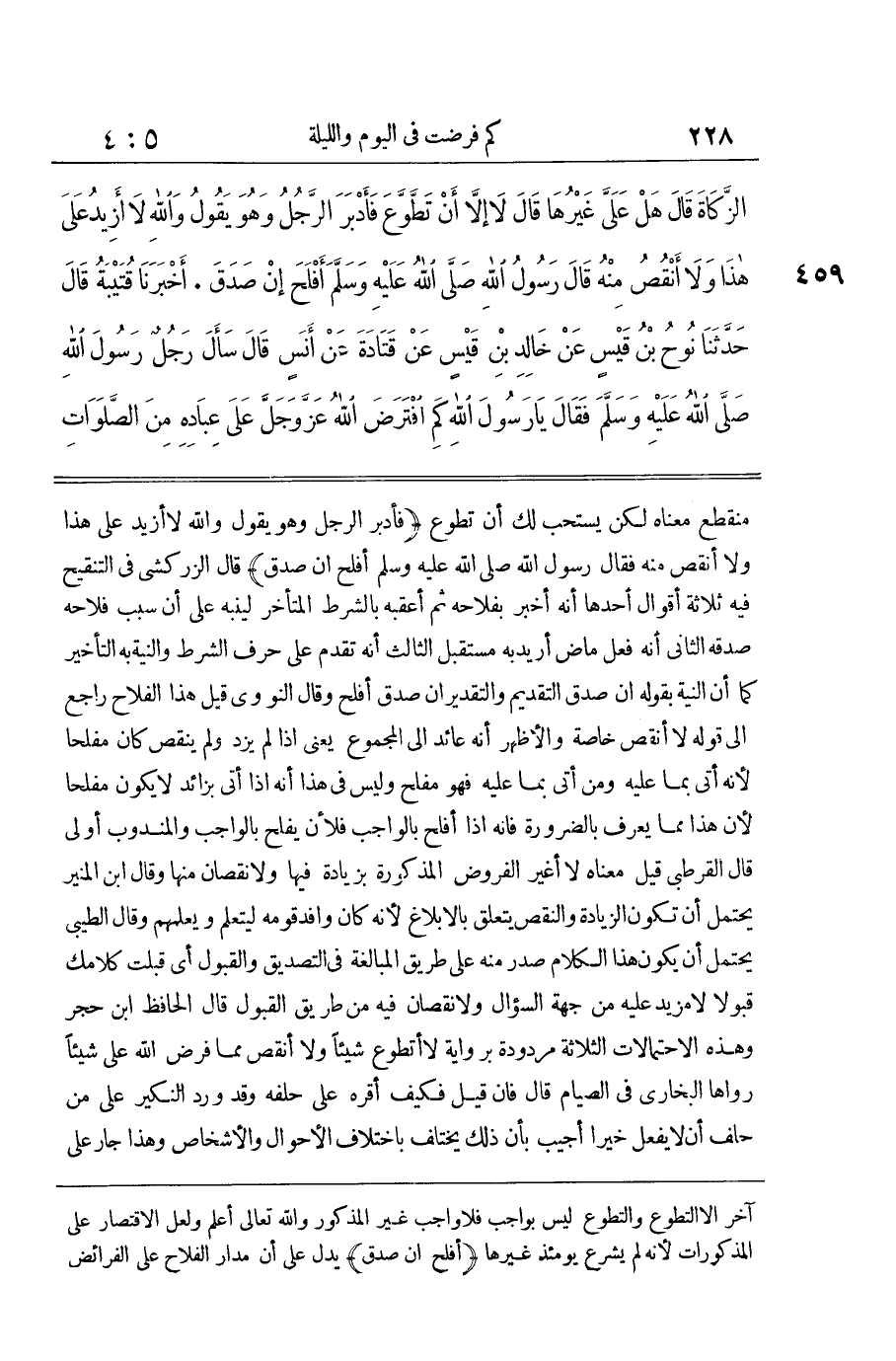 مُنْقَطِعٌ مَعْنَاهُ لَكِنْ يُسْتَحَبُّ لَكَ أَنْ تَطَوَّعَ فَأَدْبَرَ الرَّجُلُ وَهُوَ يَقُولُ وَاَللَّهِ لَا أَزِيدُ عَلَى هَذَا وَلَا أَنْقُصُ مِنْهُ فَقَالَ رَسُولُ اللَّهِ صَلَّى اللَّهُ عَلَيْهِ وَسَلَّمَ أَفْلَحَ إِنْ صَدَقَ قَالَ الزَّرْكَشِيُّ فِي التَّنْقِيحِ فِيهِ ثَلَاثَةُ أَقْوَالٍ أَحَدُهَا أَنَّهُ أَخْبَرَ بِفَلَاحِهِ ثُمَّ أَعْقَبَهُ بِالشَّرْطِ الْمُتَأَخِّرِ لِيُنَبِّهَ عَلَى أَنَّ سَبَبَ فَلَاحِهِ صِدْقُهُ الثَّانِي أَنَّهُ فِعْلٌ مَاضٍ أُرِيدَ بِهِ مُسْتَقْبَلٌ الثَّالِثُ أَنَّهُ تَقَدَّمَ عَلَى حَرْفِ الشَّرْطِ وَالنِّيَّةُ بِهِ التَّأْخِيرُ كَمَا أَنَّ النِّيَّةَ بِقَوْلِهِ إِنْ صَدَقَ التَّقْدِيمُ وَالتَّقْدِيرُ إِنْ صَدَقَ أَفْلَحَ وَقَالَ النَّوَوِيُّ قِيلَ هَذَا الْفَلَاحُ رَاجِعٌ إِلَى قَوْلِهِ لَا أَنْقُصُ خَاصَّةً وَالْأَظْهَرُ أَنَّهُ عَائِدٌ إِلَى الْمَجْمُوعِ يَعْنِي إِذَا لَمْ يَزِدْ وَلَمْ يَنْقُصْ كَانَ مُفْلِحًا لِأَنَّهُ أَتَى بِمَا عَلَيْهِ وَمَنْ أَتَى بِمَا عَلَيْهِ فَهُوَ مُفْلِحٌ وَلَيْسَ فِي هَذَا أَنَّهُ إِذَا أَتَى بِزَائِدٍ لَا يَكُونُ مُفْلِحًا لِأَنَّ هَذَا مِمَّا يُعْرَفُ بِالضَّرُورَةِ فَإِنَّهُ إِذَا أَفْلَحَ بِالْوَاجِبِ فَلَأَنْ يُفْلِحَ بِالْوَاجِبِ وَالْمَنْدُوبِ أَوْلَى قَالَ الْقُرْطُبِيُّ قِيلَ مَعْنَاهُ لَا أُغَيِّرُ الْفُرُوضَ الْمَذْكُورَةَ بِزِيَادَةٍ فِيهَا وَلَا نُقْصَانٍ مِنْهَا وَقَالَ بن الْمُنِيرِ يَحْتَمِلُ أَنْ تَكُونَ الزِّيَادَةُ وَالنَّقْصُ يَتَعَلَّقُ بِالْإِبْلَاغِ لِأَنَّهُ كَانَ وَافِدَ قَوْمِهِ لِيَتَعَلَّمَ وَيُعَلِّمَهُمْ وَقَالَ الطِّيبِيُّ يَحْتَمِلُ أَنْ يَكُونَ هَذَا الْكَلَامُ صَدَرَ مِنْهُ عَلَى طَرِيقِ الْمُبَالَغَةِ فِي التَّصْدِيقِ وَالْقَبُولِ أَيْ قَبِلْتُ كَلَامَكَ قَبُولًا لَا مَزِيدَ عَلَيْهِ مِنْ جِهَةِ السُّؤَالِ وَلَا نُقْصَانَ فِيهِ من طَرِيق الْقبُول قَالَ الْحَافِظ بن حَجَرٍ وَهَذِهِ الِاحْتِمَالَاتُ الثَّلَاثَةُ مَرْدُودَةٌ بِرِوَايَةِ لَا أَتَطَوَّعُ شَيْئًا وَلَا أَنْقُصُ مِمَّا فَرَضَ اللَّهُ عَلَيَّ شَيْئًا رَوَاهَا الْبُخَارِيُّ فِي الصِّيَامِ قَالَ فَإِنْ قِيلَ فَكَيْفَ أَقَرَّهُ عَلَى حَلِفِهِ وَقَدْ وَرَدَ النَّكِيرُ عَلَى مَنْ حَلَفَ أَنْ لَا يَفْعَلَ خَيْرًا أُجِيبَ بِأَنَّ ذَلِكَ يَخْتَلِفُ بِاخْتِلَافِ الْأَحْوَالِ وَالْأَشْخَاصِ وَهَذَا جَارٍ عَلَى