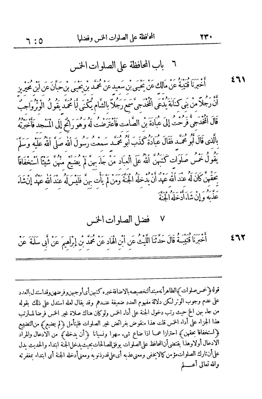 [461] خمس صلوَات الظَّاهِر أَنه مُبْتَدأ لتخصيصه بِالْإِضَافَة خَبره كتبهن أَي أوجبهن وفرضهن وَقد اسْتدلَّ بِالْعدَدِ على عدم وجوب الْوتر لَكِن دلَالَة مَفْهُوم الْعدَد ضَعِيفَة عِنْدهم وَقد يُقَال لَعَلَّه اسْتدلَّ على ذَلِك بقوله من جَاءَ بِهن الخ حَيْثُ رتب دُخُول الْجنَّة على أَدَاء الْخمس وَلَو كَانَ هُنَاكَ صَلَاة غير الْخمس فرضا لما رتب هَذَا الْجَزَاء على أَدَاء الْخمس قلت هَذَا منقوض بفرائض غير الصَّلَوَات فَلْيتَأَمَّل لم يضيع من التضييع اسْتِخْفَافًا بحقهن احْتِرَازًا عَمَّا إِذا ضَاعَ شَيْء سَهوا ونسيانا أَن يدْخلهُ من الادخال وَالْمرَاد الادخال أَولا وَهَذَا يَقْتَضِي أَن المحافظ على الصَّلَوَات يوفق للصالحات بِحَيْثُ يدْخل الْجنَّة ابْتِدَاء والْحَدِيث يدل على أَن تَارِك الصَّلَوَات مُؤمن كَمَا لَا يخفى وَمعنى عذبه أَي على قدر ذنُوبه وَمعنى أدخلهُ الْجنَّة أَي ابْتِدَاء بمغفرته وَالله تَعَالَى أعلم