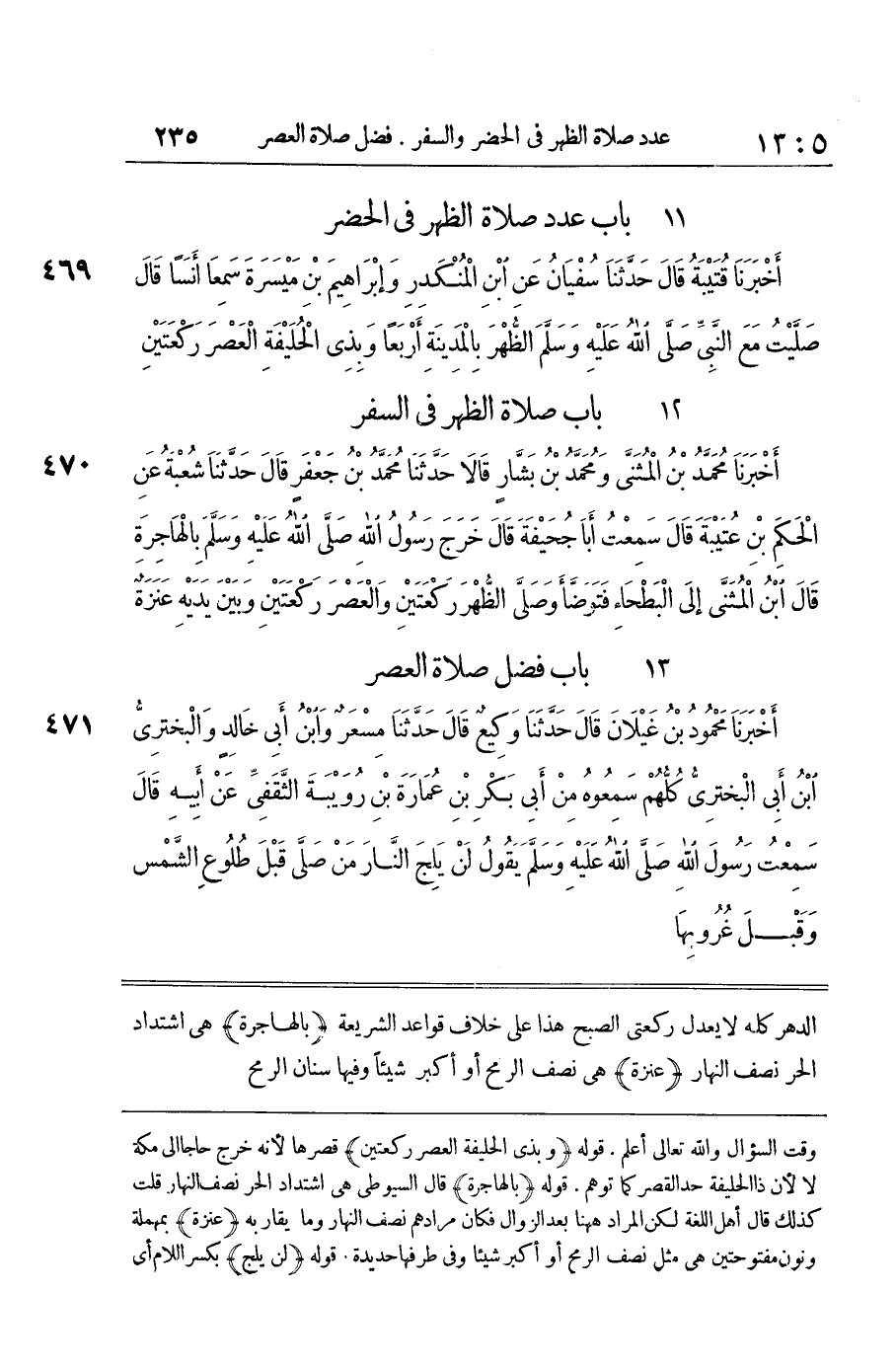 الدَّهْرِ كُلِّهِ لَا يَعْدِلُ رَكْعَتَيِ الصُّبْحِ هَذَا على خلاف قَوَاعِد الشَّرِيعَة بِالْهَاجِرَةِ هِيَ اشْتِدَادُ الْحَرِّ نِصْفَ النَّهَارِ عَنَزَةٌ هِيَ نِصْفُ الرُّمْحِ أَوْ أَكْبَرُ شَيْئًا وَفِيهَا سِنَان الرمْح