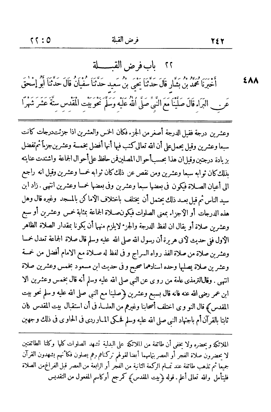 [488] صَلَّيْنَا مَعَ النَّبِيِّ صَلَّى اللَّهُ عَلَيْهِ وَسَلَّمَ نَحْوَ بَيْتِ الْمَقْدِسِ قَالَ النَّوَوِيُّ اخْتَلَفَ أَصْحَابُنَا وَغَيْرُهُمْ مِنَ الْعُلَمَاءِ فِي أَنَّ اسْتِقْبَالَ بَيْتِ الْمَقْدِسِ كَانَ ثَابِتًا بِالْقُرْآنِ أَمْ بِاجْتِهَادِ النَّبِيِّ صَلَّى اللَّهُ عَلَيْهِ وَسَلَّمَ فَحَكَى الْمَاوَرْدِيُّ فِي الْحَاوِي فِي ذَلِكَ وَجْهَيْنِ