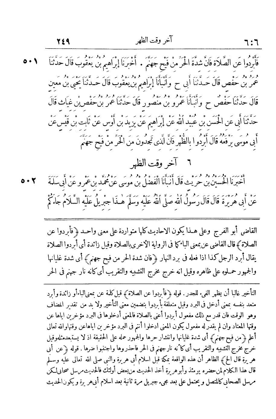 [500] فَأَبْرِدُوا عَنِ الصَّلَاةِ قَالَ الْقَاضِي عَنْ بِمَعْنَى الْبَاءِ كَمَا فِي الرِّوَايَةِ الْأُخْرَى بِالصَّلَاةِ وَقِيلَ زَائِدَةٌ أَيْ أَبْرِدُوا الصَّلَاةَ يُقَالُ أَبْرَدَ الرَّجُلُ كَذَا إِذَا فَعَلَهُ فِي بَرْدِ النَّهَارِ فَإِنَّ شِدَّةَ الْحَرِّ مِنْ فَيْحِ جَهَنَّمَ أَيْ شِدَّةِ غَلَيَانِهَا وَالْجُمْهُورُ حَمَلُوهُ عَلَى ظَاهِرِهِ وَقِيلَ إِنَّهُ خَرَجَ مَخْرَجَ التَّشْبِيهِ وَالتَّقْرِيبِ أَيْ كَأَنَّهُ نَارُ جَهَنَّم فِي الْحر
