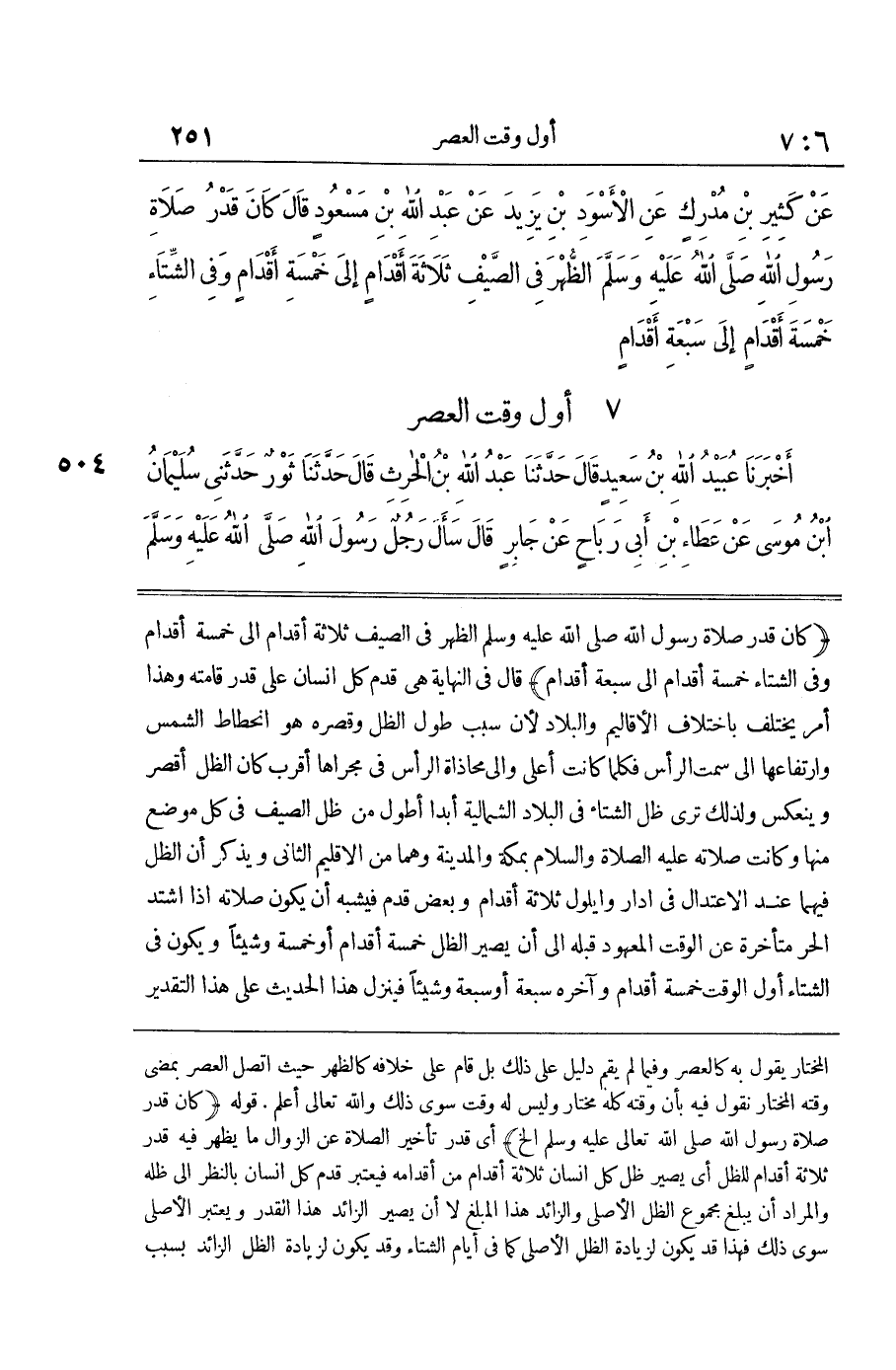 [503] كَانَ قَدْرُ صَلَاةِ رَسُولِ اللَّهِ صَلَّى اللَّهُ عَلَيْهِ وَسَلَّمَ الظُّهْرُ فِي الصَّيْفِ ثَلَاثَةُ أَقْدَامٍ إِلَى خَمْسَةِ أَقْدَامٍ وَفِي الشِّتَاءِ خَمْسَةُ أَقْدَامٍ إِلَى سَبْعَةِ أَقْدَامٍ قَالَ فِي النِّهَايَةِ هِيَ قَدَمُ كُلِّ إِنْسَانٍ عَلَى قَدْرِ قَامَتِهِ وَهَذَا أَمْرٌ يَخْتَلِفُ بِاخْتِلَافِ الْأَقَالِيمِ وَالْبِلَادِ لِأَنَّ سَبَبَ طُولِ الظِّلِّ وَقِصَرِهِ هُوَ انْحِطَاطُ الشَّمْسِ وَارْتِفَاعُهَا إِلَى سَمْتِ الرَّأْسِ فَكُلَّمَا كَانَتْ أَعْلَى وَإِلَى مُحَاذَاةِ الرَّأْسِ فِي مَجْرَاهَا أَقْرَبَ كَانَ الظِّلُّ أَقْصَرَ وَيَنْعَكِسُ وَلِذَلِكَ تَرَى ظِلَّ الشِّتَاءِ فِي الْبِلَادِ الشَّمَالِيَّةِ أَبَدًا أَطْوَلَ مِنْ ظِلِّ الصَّيْفِ فِي كل مَوضِع مِنْهَا وَكَانَت صلَاته عَلَيْهِ الصَّلَاة وَالسَّلَام بِمَكَّةَ وَالْمَدِينَةِ وَهُمَا مِنَ الْإِقْلِيمِ الثَّانِي وَيُذْكَرُ أَنَّ الظِّلَّ فِيهِمَا عِنْدَ الِاعْتِدَالِ فِي أَدَارَ وَأَيْلُولَ ثَلَاثَةُ أَقْدَامٍ وَبَعْضُ قَدَمٍ فَيُشْبِهُ أَنْ يَكُونَ صَلَاتُهُ إِذَا اشْتَدَّ الْحَرُّ مُتَأَخِّرَةً عَنِ الْوَقْتِ الْمَعْهُودِ قَبْلَهُ إِلَى أَنْ يَصِيرَ الظِّلُّ خَمْسَةَ أَقْدَامٍ أَوْ خَمْسَةً وَشَيْئًا وَيَكُونُ فِي الشِّتَاءِ أَوَّلُ الْوَقْتِ خَمْسَةُ أَقْدَامٍ وَآخِرُهُ سَبْعَةٌ أَوْ سَبْعَةٌ وَشَيْئًا فَيَنْزِلُ هَذَا الْحَدِيثُ عَلَى هَذَا التَّقْدِير