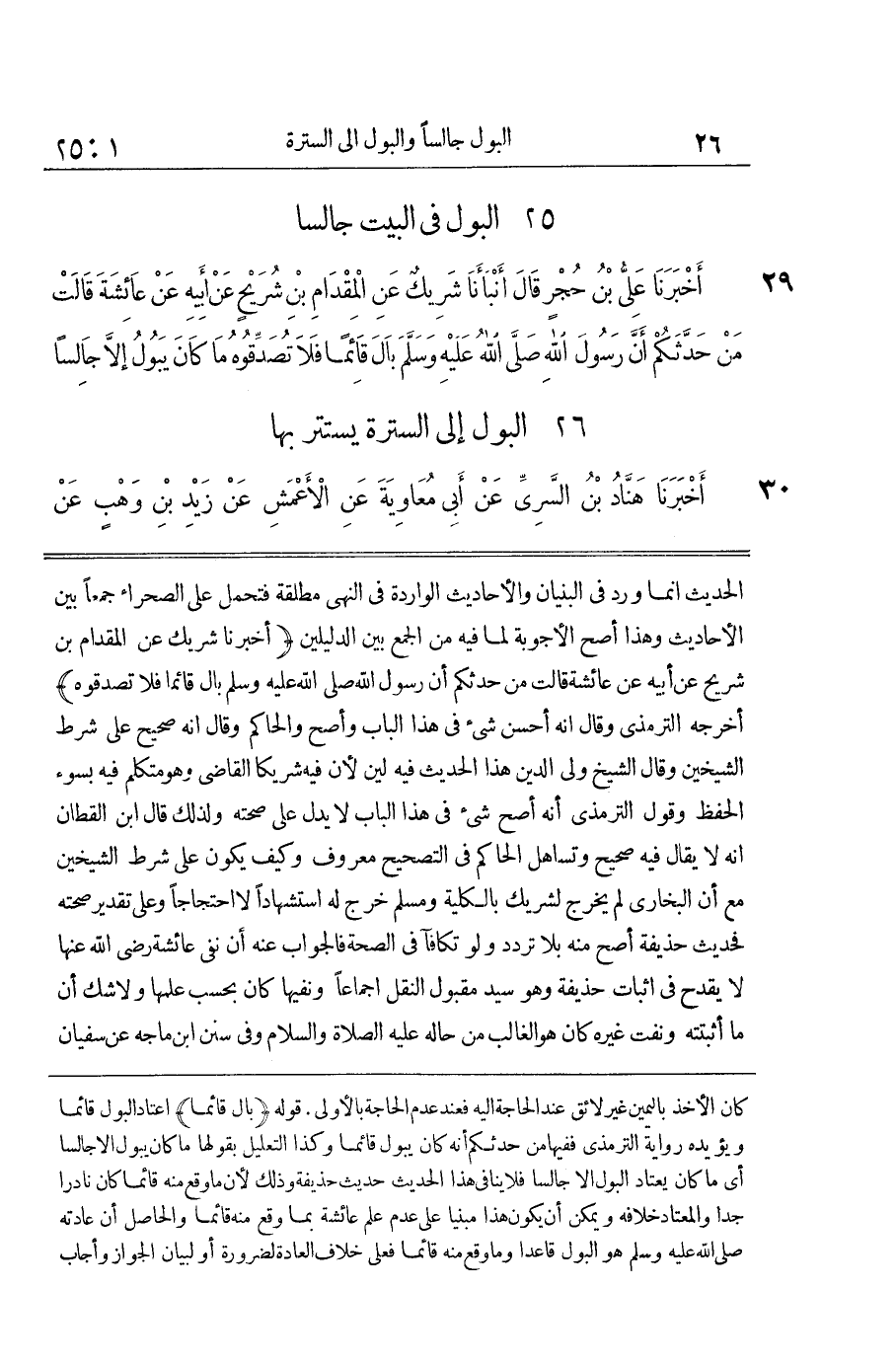 [29] أَخْبَرَنَا شَرِيكٌ عَنِ الْمِقْدَامِ بْنِ شُرَيْحٍ عَنْ أَبِيهِ عَنْ عَائِشَةَ قَالَتْ مَنْ حَدَّثَكُمْ أَنَّ رَسُولَ اللَّهِ صَلَّى اللَّهُ عَلَيْهِ وَسَلَّمَ بَالَ قَائِمًا فَلَا تُصَدِّقُوهُ أَخْرَجَهُ التِّرْمِذِيُّ وَقَالَ إِنَّهُ أَحْسَنُ شَيْءٍ فِي هَذَا الْبَابِ وَأَصَحُّ وَالْحَاكِمُ وَقَالَ إِنَّهُ صَحِيحٌ عَلَى شَرْطِ الشَّيْخَيْنِ وَقَالَ الشَّيْخُ وَلِيُّ الدِّينِ هَذَا الْحَدِيثُ فِيهِ لِينٌ لِأَنَّ فِيهِ شَرِيكًا الْقَاضِي وَهُوَ مُتَكَلَّمٌ فِيهِ بِسُوءِ الْحِفْظِ وَقَوْلُ التِّرْمِذِيِّ إِنَّهُ أَصَحُّ شَيْءٍ فِي هَذَا الْبَابِ لَا يَدُلُّ عَلَى صِحَّتِهِ وَلذَلِك قَالَ بن الْقَطَّانِ إِنَّهُ لَا يُقَالُ فِيهِ صَحِيحٌ وَتَسَاهُلُ الْحَاكِمِ فِي التَّصْحِيحِ مَعْرُوفٌ وَكَيْفَ يَكُونُ عَلَى شَرْطِ الشَّيْخَيْنِ مَعَ أَنَّ الْبُخَارِيَّ لَمْ يُخَرِّجْ لِشَرِيكٍ بِالْكُلِّيَّةِ وَمُسْلِمٌ خَرَّجَ لَهُ اسْتِشْهَادًا لَا احْتِجَاجًا وَعَلَى تَقْدِيرِ صِحَّتِهِ فَحَدِيثُ حُذَيْفَةَ أَصَحُّ مِنْهُ بِلَا تَرَدُّدٍ وَلَوْ تَكَافَآ فِي الصِّحَّةِ فَالْجَوَابُ عَنْهُ أَنَّ نَفْيَ عَائِشَةَ رَضِيَ اللَّهُ عَنْهَا لَا يَقْدَحُ فِي إِثْبَاتِ حُذَيْفَةَ وَهُوَ سَيِّدٌ مَقْبُولُ النَّقْلِ إِجْمَاعًا وَنَفْيُهَا كَانَ بِحَسَبِ عِلْمِهَا وَلَا شَكَّ أَنَّ مَا أَثْبَتَتْهُ وَنَفَتْ غَيْرَهُ كَانَ هُوَ الْغَالِبُ مِنْ حَالِهِ عَلَيْهِ الصَّلَاة وَالسَّلَام وَفِي سنَن بن مَاجَهْ عَنْ سُفْيَانَ