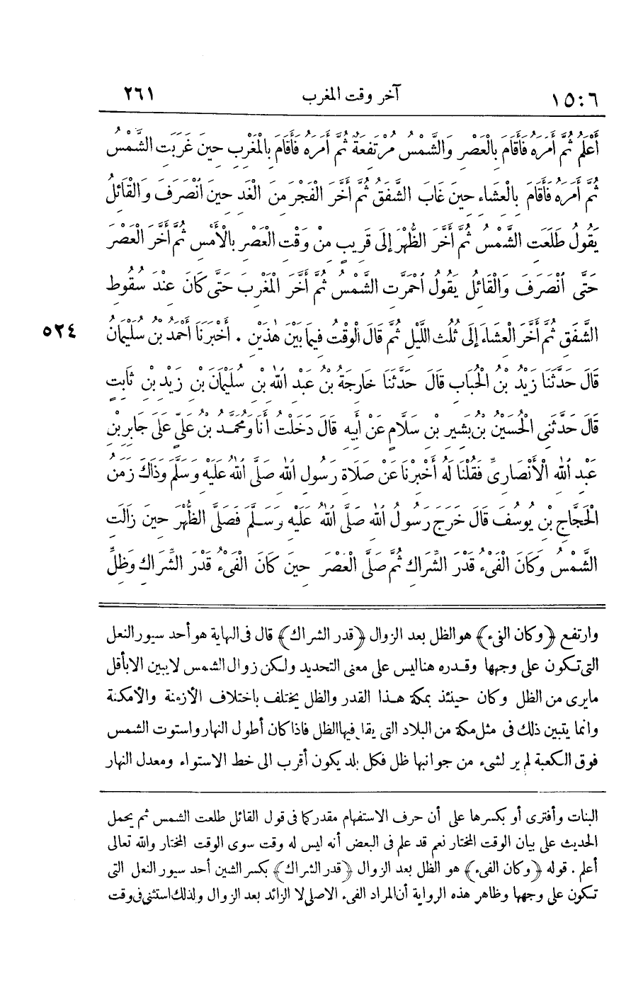 [524] وَكَانَ الْفَيْءُ هُوَ الظِّلُّ بَعْدَ الزَّوَالِ قَدْرَ الشِّرَاكِ قَالَ فِي النِّهَايَةِ هُوَ أَحَدُ سُيُورِ النَّعْلِ الَّتِي تَكُونُ عَلَى وَجْهِهَا وَقَدْرُهُ هُنَا لَيْسَ عَلَى مَعْنَى التَّحْدِيدِ وَلَكِنْ زَوَالُ الشَّمْسِ لَا يَبِينُ إِلَّا بِأَقَلَّ مَا يُرَى مِنَ الظِّلِّ وَكَانَ حِينَئِذٍ بِمَكَّةَ هَذَا الْقَدْرُ وَالظِّلُّ يَخْتَلِفُ بِاخْتِلَافِ الْأَزْمِنَةِ وَالْأَمْكِنَةِ وَإِنَّمَا يَتَبَيَّنُ ذَلِكَ فِي مِثْلِ مَكَّةَ مِنَ الْبِلَادِ الَّتِي يَقِلُّ فِيهَا الظِّلُّ فَإِذَا كَانَ أَطْوَلُ النَّهَارِ وَاسْتَوَتِ الشَّمْسُ فَوْقَ الْكَعْبَةِ لَمْ يُرَ لِشَيْءٍ مِنْ جَوَانِبِهَا ظِلٌّ فَكُلُّ بَلَدٍ يَكُونُ أَقْرَبَ إِلَى خَطِّ الِاسْتِوَاءِ وَمُعَدَّلُ النَّهَارِ يَكُونُ الظِّلُّ فِيهِ أَقْصَرَ وَكُلَّمَا بَعُدَ عَنْهُمَا إِلَى جِهَةِ الشِّمَالِ يَكُونُ الظِّلُّ فِيهِ أَطْوَلَ الْعَنَقِ بِفَتْحِ الْمُهْمَلَةِ وَالنُّون وقاف سير سريع