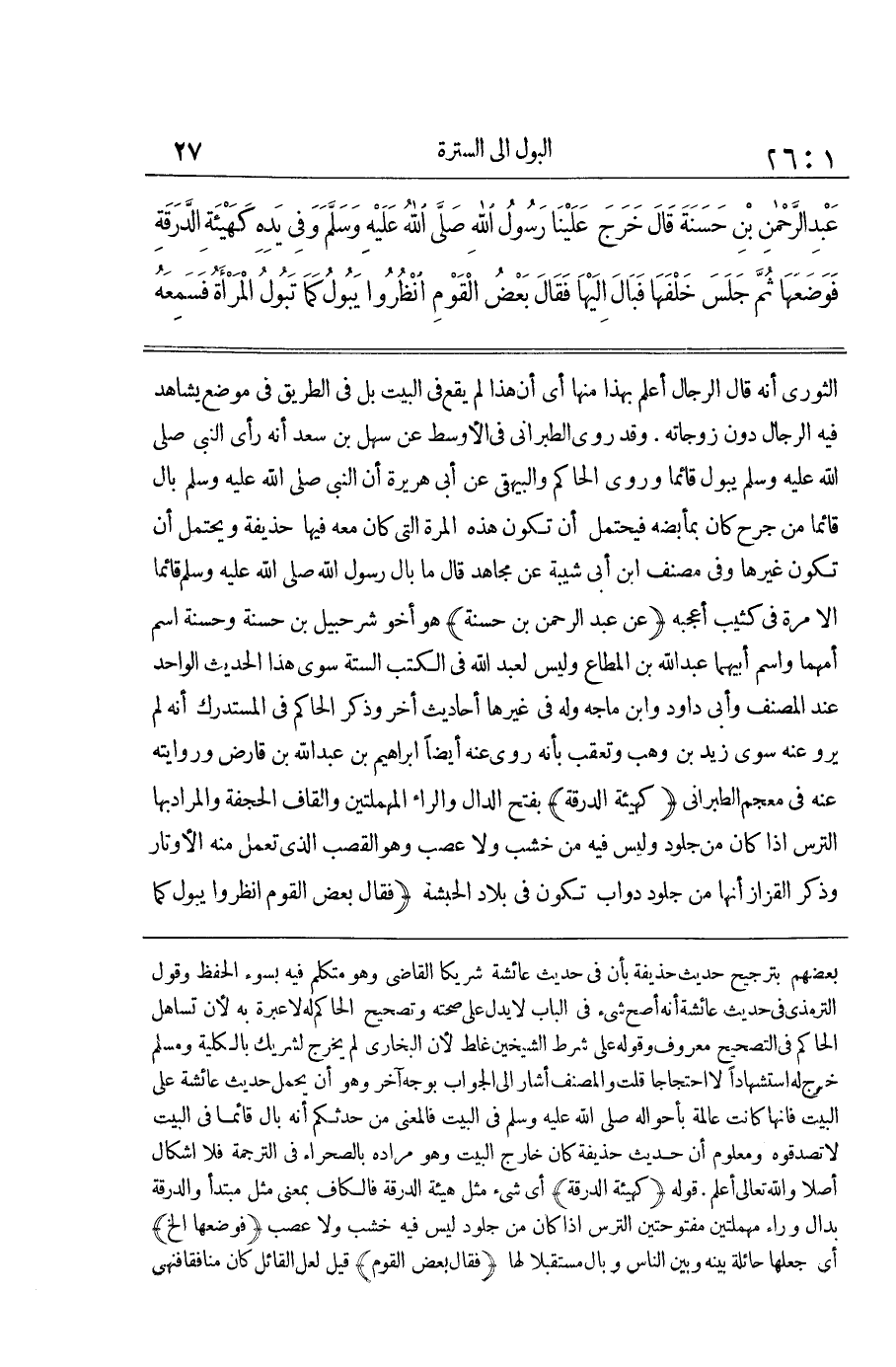 [30] عَن عبد الرَّحْمَن بن حَسَنَة هُوَ أَخُو شُرَحْبِيل بن حَسَنَةَ وَحَسَنَةُ اسْمُ أُمِّهِمَا وَاسْمُ أَبِيهِمَا عَبْدُ اللَّهِ بْنُ الْمُطَاعِ وَلَيْسَ لِعَبْدِ اللَّهِ فِي الْكُتُبِ السِّتَّةِ سِوَى هَذَا الْحَدِيثِ الْوَاحِدِ عِنْدَ المُصَنّف وَأبي دَاوُد وبن مَاجَهْ وَلَهُ فِي غَيْرِهَا أَحَادِيثُ أُخَرُ وَذَكَرَ الْحَاكِمُ فِي الْمُسْتَدْرَكِ أَنَّهُ لَمْ يَرْوِ عَنْهُ سِوَى زَيْدِ بْنِ وَهْبٍ وَتُعُقِّبَ بِأَنَّهُ رَوَى عَنْهُ أَيْضًا إِبْرَاهِيمُ بْنُ عَبْدِ اللَّهِ بْنِ قَارِضٍ وَرِوَايَتُهُ عَنْهُ فِي مُعْجَمِ الطَّبَرَانِيِّ كَهَيْئَةِ الدَّرَقَةِ بِفَتْحِ الدَّالِ وَالرَّاءِ الْمُهْمَلَتَيْنِ وَالْقَافِ الْحَجَفَةُ وَالْمُرَادُ بِهَا التُّرْسُ إِذَا كَانَ مِنْ جُلُودٍ وَلَيْسَ فِيهِ مِنْ خَشَبٍ وَلَا عَصَبٍ وَهُوَ الْقَصَبُ الَّذِي تُعْمَلُ مِنْهُ الْأَوْتَارُ وَذَكَرَ الْقَزَّازُ أَنَّهَا مِنْ جُلُودِ دَوَابٍّ تَكُونُ فِي بِلَادِ الْحَبَشَةِ فَقَالَ بَعْضُ الْقَوْمِ اُنْظُرُوا يَبُولُ كَمَا