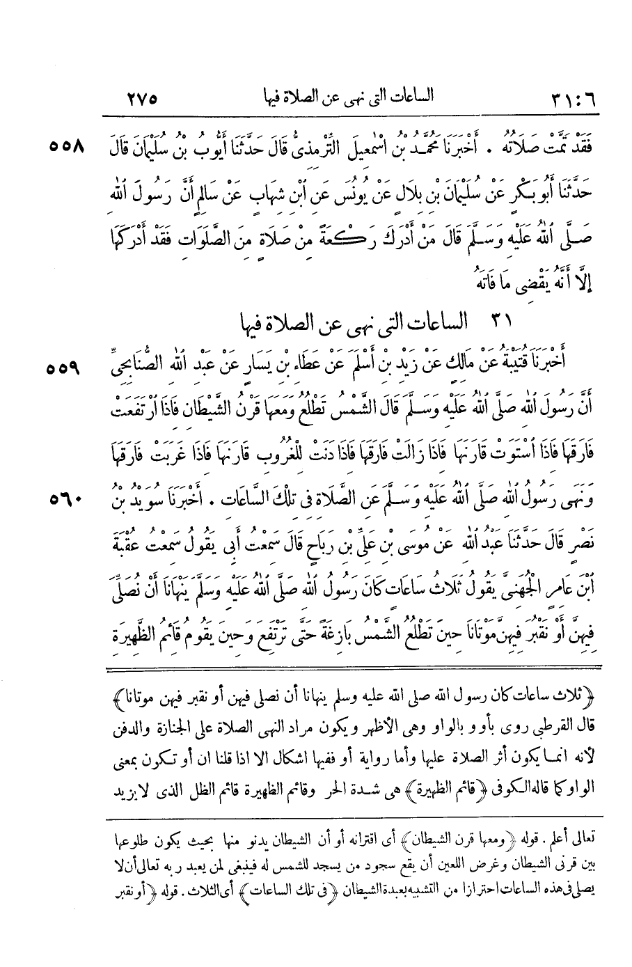 [560] ثَلَاثُ سَاعَاتٍ كَانَ رَسُولُ اللَّهِ صَلَّى اللَّهُ عَلَيْهِ وَسَلَّمَ يَنْهَانَا أَنْ نُصَلِّيَ فِيهِنَّ أَوْ نَقْبُرَ فِيهِنَّ مَوْتَانَا قَالَ الْقُرْطُبِيُّ رُوِيَ بِأَوْ وَبِالْوَاوِ وَهِيَ الْأَظْهَرُ وَيَكُونُ مُرَادُ النَّهْيِ الصَّلَاةَ عَلَى الْجِنَازَةِ وَالدَّفْنِ لِأَنَّهُ إِنَّمَا يَكُونُ أَثَرُ الصَّلَاةِ عَلَيْهَا وَأَمَّا رِوَايَةُ أَوْ فَفِيهَا إِشْكَالٌ إِلَّا إِذَا قُلْنَا إِنَّ أَوْ تَكُونُ بِمَعْنَى الْوَاوِ كَمَا قَالَهُ الْكُوفِيُّ قَائِمُ الظَّهِيرَةِ هِيَ شِدَّةُ الْحَرِّ وَقَائِمُ الظَّهِيرَةِ قَائِمُ الظِّلِّ الَّذِي لَا يزِيد