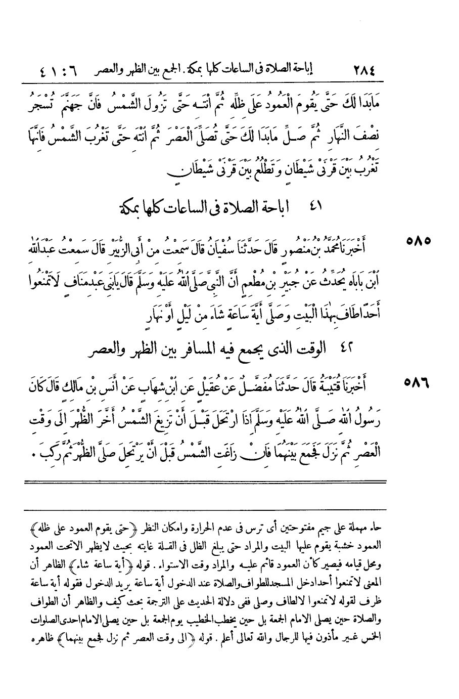 [586] إِلَى وَقْتِ الْعَصْرِ ثُمَّ نَزَلَ فَجَمَعَ بَيْنَهُمَا ظَاهره أَنه كَانَ يجمع بَينهمَا فِي وَقت الْعَصْر وَمن لَا يَقُول بِهِ يحمل قَوْله إِلَى وَقت الْعَصْر على معنى إِلَى قرب وَقت الْعَصْر وَيحمل الْجمع على الْجمع فعلا لَا وقتا وَهُوَ أَن يُصَلِّي الظّهْر فِي آخر وقته بِحَيْثُ يتَّصل خُرُوج الْوَقْت وَدخُول وَقت الْعَصْر بفراغه ثمَّ يُصَلِّي الْعَصْر فِي أول وقته وَالله تَعَالَى اعْلَم قَوْله