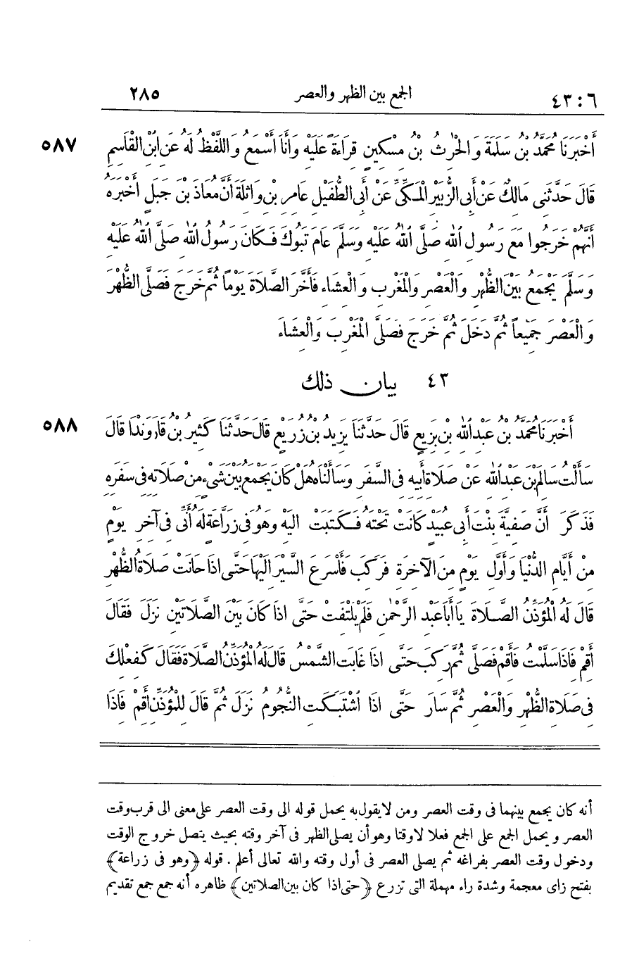 [588] وَهُوَ فِي زراعة بِفَتْح زَاي مُعْجمَة وَشدَّة رَاء مُهْملَة الَّتِي تزرع حَتَّى إِذا كَانَ بَين الصَّلَاتَيْنِ ظَاهره أَنه جمع جمع تَقْدِيم فِي آخر وَقت الظّهْر وَيحْتَمل أَنه جمع فعلا وَأما جمع التَّأْخِير فَهَذَا اللَّفْظ يَأْبَى عَنهُ وَالله تَعَالَى أعلم فَليصل هَذِه الصَّلَاة بِضَم الْيَاء وَتَشْديد اللَّام وَالْمرَاد فَليصل هَكَذَا أَو بِفَتْح الْيَاء وَتَخْفِيف اللَّام فليجمع هَذِه الصَّلَاة قَوْله ثمانيا أَي ثَمَانِي رَكْعَات أَربع رَكْعَات لِلظهْرِ وَأَرْبع رَكْعَات للعصر وَالْأَحْسَن فِي تَأْوِيله أَنه جمع فعلا لَا وقتا فَأخر الظّهْر إِلَى آخر وقته وَعجل الْعَصْر فِي أول وقته وَهُوَ الأوفق بقوله أخر الظّهْر وَعجل الْعَصْر وَالله تَعَالَى أعلم قَوْله الأولى أَي الظّهْر فَإِنَّهُم كَانُوا يسمون الظّهْر الأولى لكَونهَا أول صَلَاة صلى جِبْرِيل بِالنَّبِيِّ صلى الله تعالىعليه وَسلم ثَمَان سَجدَات أَي ثَمَان رَكْعَات فَأُرِيد بِالسَّجْدَةِ الرَّكْعَة بِاسْتِعْمَال اسْم الْجُزْء فِي الْكل قَوْله