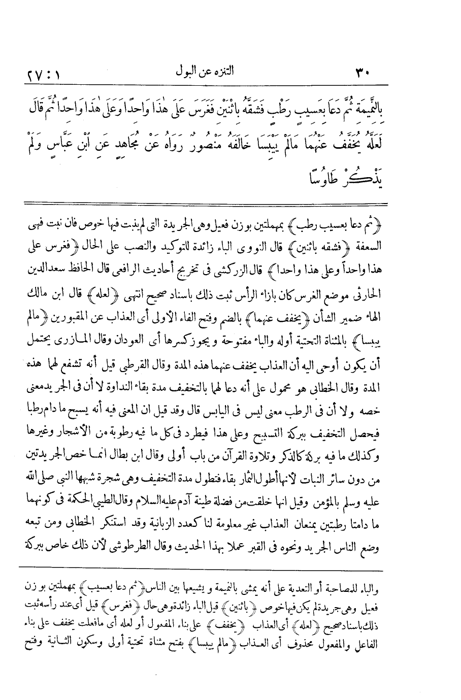 ثُمَّ دَعَا بِعَسِيبٍ رَطْبٍ بِمُهْمَلَتَيْنِ بِوَزْنِ فَعِيلٍ وَهِيَ الْجَرِيدَةُ الَّتِي لَمْ يَنْبُتْ فِيهَا خُوصٌ فَإِنْ نَبَتَ فَهِيَ السَّعَفَةُ فَشَقَّهُ بِاثْنَيْنِ قَالَ النَّوَوِيُّ الْبَاءُ زَائِدَةٌ لِلتَّوْكِيدِ وَالنَّصْبُ عَلَى الْحَالِ فَغَرَسَ عَلَى هَذَا وَاحِدًا وَعَلَى هَذَا وَاحِدًا قَالَ الزَّرْكَشِيُّ فِي تَخْرِيجِ أَحَادِيثِ الرَّافِعِيِّ قَالَ الْحافِظُ سَعْدُ الدِّينِ الْحَارِثِيُّ مَوْضِعُ الْغَرْسِ كَانَ بِإِزَاءِ الرَّأْسِ ثَبَتَ ذَلِكَ بِإِسْنَادٍ صَحِيحٍ انْتَهَى لَعَلَّه قَالَ بن مَالِكٍ الْهَاءُ ضَمِيرُ الشَّأْنِ يُخَفَّفُ عَنْهُمَا بِالضَّمِّ وَفَتْحِ الْفَاءِ الْأُولَى أَيِ الْعَذَابُ عَنِ الْمَقْبُورَيْنِ مَا لَمْ يَيْبَسَا بِالْمُثَنَّاةِ التَّحْتِيَّةِ أَوَّلَهُ وَالْبَاءُ مَفْتُوحَةٌ وَيَجُوزُ كَسْرُهَا أَيِ الْعُودَانِ وَقَالَ الْمَازِرِيُّ يَحْتَمِلُ أَنْ يَكُونَ أُوحِيَ إِلَيْهِ أَنَّ الْعَذَابَ يُخَفف عنهماهذه الْمُدَّةَ وَقَالَ الْقُرْطُبِيُّ قِيلَ إِنَّهُ تَشَفَّعَ لَهُمَا هَذِهِ الْمُدَّةَ وَقَالَ الْخَطَّابِيُّ هُوَ مَحْمُولٌ عَلَى أَنَّهُ دَعَا لَهُمَا بِالتَّخْفِيفِ مُدَّةَ بَقَاءِ النَّدَاوَةِ لَا أَنَّ فِي الْجَرِيدِ مَعْنًى خَصَّهُ وَلَا أَنَّ فِي الرَّطْبِ مَعْنًى لَيْسَ فِي الْيَابِسِ قَالَ وَقَدْ قِيلَ إِنَّ الْمَعْنَى فِيهِ أَنَّهُ يُسَبِّحُ مَا دَامَ رَطْبًا فَيَحْصُلُ التَّخْفِيفُ بِبَرَكَةِ التَّسْبِيحِ وَعَلَى هَذَا فَيَطَّرِدُ فِي كُلِّ مَا فِيهِ رُطُوبَةٌ مِنَ الْأَشْجَارِ وَغَيْرِهَا وَكَذَلِكَ مَا فِيهِ بركَة كالذكر وتلاوة الْقُرْآن من بَاب أولى وَقَالَ بن بَطَّالٍ إِنَّمَا خَصَّ الْجَرِيدَتَيْنِ مِنْ دُونِ سَائِرِ النَّبَاتِ لِأَنَّهَا أَطْوَلُ الثِّمَارِ بَقَاءً فَتَطُولُ مُدَّةُ التَّخْفِيفِ وَهِيَ شَجَرةٌ شَبَّهَهَا النَّبِيُّ صَلَّى اللَّهُ عَلَيْهِ وَسَلَّمَ بِالْمُؤْمِنِ وَقِيلَ إِنَّهَا خُلِقَتْ مِنْ فَضْلَةِ طِينَةِ آدَمَ عَلَيْهِ السَّلَامُ وَقَالَ الطِّيبِيُّ الْحِكْمَةُ فِي كَوْنِهِمَا مَا دَامَتَا رَطْبَتَيْنِ يَمْنَعَانِ الْعَذَابَ غَيْرُ مَعْلُومَةٍ لَنَا كَعَدَدِ الزَّبَانِيَةِ وَقَدِ اسْتَنْكَرَ الْخَطَّابِيُّ وَمَنْ تَبِعَهُ وَضْعَ النَّاسِ الْجَرِيدَ وَنَحْوَهُ فِي الْقَبْرِ عَمَلًا بِهَذَا الْحَدِيثِ وَقَالَ الطُّرْطُوشِيُّ لِأَنَّ ذَلِكَ خَاصُّ بِبَرَكَةِ
