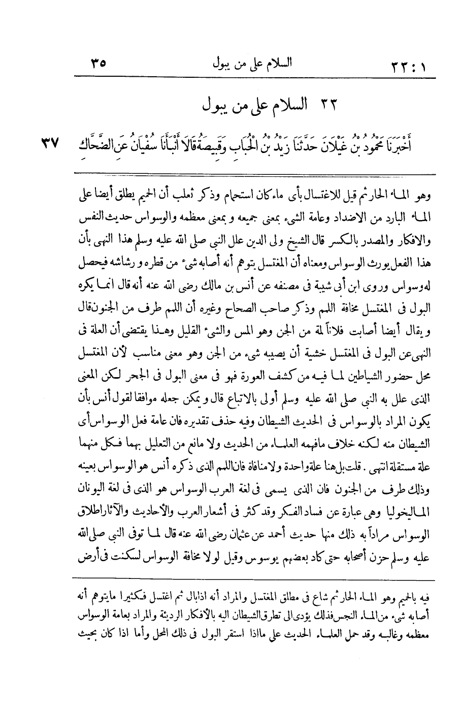 وَهُوَ الْمَاءُ الْحَارُّ ثُمَّ قِيلَ لِلِاغْتِسَالِ بِأَيِّ مَاءٍ كَانَ اسْتِحْمَامٌ وَذَكَرَ ثَعْلَبُ أَنَّ الْحَمِيمَ يُطْلَقُ أَيْضًا عَلَى الْمَاءِ الْبَارِدِ مِنَ الْأَضْدَادِ وَعَامَّةُ الشَّيْءِ بِمَعْنَى جَمِيعِهِ وَبِمَعْنَى مُعْظَمِهِ وَالْوَسْوَاسُ حَدِيثُ النَّفْسِ وَالْأَفْكَارِ وَالْمَصْدَرُ بِالْكَسْرِ قَالَ الشَّيْخُ وَلِيُّ الدِّينِ عَلَّلَ النَّبِيُّ صَلَّى اللَّهُ عَلَيْهِ وَسَلَّمَ هَذَا النَّهْيَ بِأَنَّ هَذَا الْفِعْلَ يُورِثُ الوسواس وَمَعْنَاهُ أَنَّ الْمُغْتَسِلَ يَتَوَهَّمُ أَنَّهُ أَصَابَهُ شَيْءٌ مِنْ قطره ورشاشه فَيحصل لَهُ وسواس وروى بن أَبِي شَيْبَةَ فِي مُصَنَّفِهِ عَنْ أَنَسِ بْنِ مَالِكٍ رَضِيَ اللَّهُ عَنْهُ أَنَّهُ قَالَ إِنَّمَا يُكْرَهُ الْبَوْلُ فِي الْمُغْتَسَلِ مَخَافَةَ اللَّمَمِ وَذَكَرَ صَاحِبُ الصِّحَاحِ وَغَيْرُهُ أَنَّ اللَّمَمَ طَرَفٌ مِنَ الْجُنُونِ قَالَ وَيُقَالُ أَيْضًا أَصَابَتْ فُلَانًا لَمَّةٌ من الْجِنّ وَهُوَ الْمَسُّ وَالشَّيْءُ الْقَلِيلُ وَهَذَا يَقْتَضِي أَنَّ الْعِلَّةَ فِي النَّهْيِ عَنِ الْبَوْلِ فِي الْمُغْتَسَلِ خَشْيَةَ أَنْ يُصِيبَهُ شَيْءٌ مِنَ الْجِنِّ وَهُوَ مَعْنًى مُنَاسِبٌ لِأَنَّ الْمُغْتَسَلَ مَحَلُّ حُضُورِ الشَّيَاطِينِ لِمَا فِيهِ مَنْ كَشْفِ الْعَوْرَةِ فَهُوَ فِي مَعْنَى الْبَوْلِ فِي الْجُحْرِ لَكِنَّ الْمَعْنَى الَّذِي عَلَّلَ بِهِ النَّبِيُّ صَلَّى اللَّهُ عَلَيْهِ وَسَلَّمَ أَوْلَى بِالِاتِّبَاعِ قَالَ وَيُمْكِنُ جَعْلُهُ مُوَافِقًا لِقَوْلِ أَنَسٍ بِأَنْ يَكُونَ الْمُرَادُ بِالْوَسْوَاسِ فِي الْحَدِيثِ الشَّيْطَانُ وَفِيهِ حَذْفٌ تَقْدِيرُهُ فَإِنَّ عَامَّةَ فِعْلِ الْوَسْوَاسِ أَيِ الشَّيْطَانِ مِنْهُ لَكِنَّهُ خِلَافُ مَا فَهِمَهُ الْعُلَمَاءُ مِنَ الْحَدِيثِ وَلَا مَانِعَ مِنَ التَّعْلِيلِ بِهِمَا فَكُلٌّ مِنْهُمَا عِلَّةٌ مُسْتَقِلَّةٌ انْتَهَى قُلْتُ بَلْ هُنَا عِلَّةٌ وَاحِدَةٌ وَلَا مُنَافَاةَ فَإِنَّ اللَّمَمَ الَّذِي ذَكَرَهُ أَنَسٌ هُوَ الْوَسْوَاسُ بِعَيْنِهِ وَذَلِكَ طَرَفٌ مِنَ الْجُنُونِ فَإِنَّ الَّذِي يُسَمَّى فِي لُغَةِ الْعَرَبِ الْوَسْوَاسُ هُوَ الَّذِي فِي لُغَةِ الْيُونَانِ المَالَيْخُولِيا وَهِيَ عِبَارَةٌ عَنْ فَسَادِ الْفِكْرِ وَقَدْ كَثُرَ فِي أَشْعَارِ الْعَرَبِ وَالْأَحَادِيثِ وَالْآثَارِ إِطْلَاقُ الْوَسْوَاسِ مُرَادًا بِهِ ذَلِكَ مِنْهَا حَدِيثُ أَحْمَدَ عَنْ عُثْمَانَ رَضِيَ اللَّهُ عَنْهُ قَالَ لَمَّا تُوُفِّيَ النَّبِيُّ صَلَّى اللَّهُ عَلَيْهِ وَسَلَّمَ حَزِنَ أَصْحَابُهُ حَتَّى كَادَ بَعْضُهُمْ يُوَسْوَسُ وَقِيلَ لَوْلَا مَخَافَةُ الْوَسْوَاسِ لَسَكَنْتُ فِي أَرض
