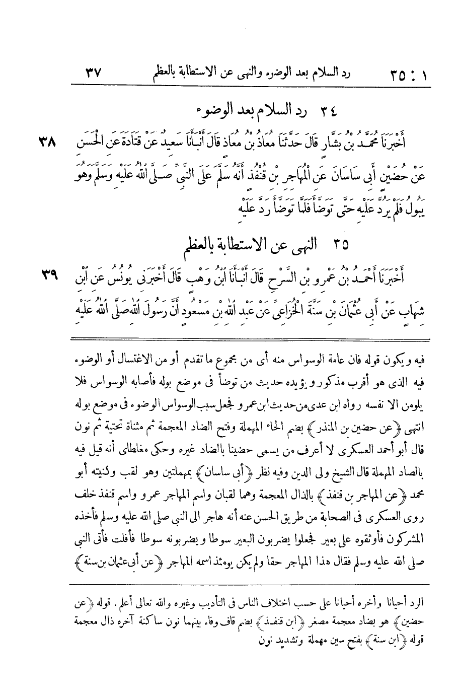 [38] عَنْ حُضَيْنِ بْنِ الْمُنْذِرِ بِضَمِّ الْحَاءِ الْمُهْمَلَةِ وَفَتْحِ الضَّادِ الْمُعْجَمَةِ ثُمَّ مُثَنَّاةٍ تَحْتِيَّةٍ ثُمَّ نُونٍ قَالَ أَبُو أَحْمَدَ الْعَسْكَرِيُّ لَا أَعْرِفُ مَنْ يُسَمَّى حُضَيْنًا بِالضَّادِ غَيْرَهُ وَحَكَى مُغَلْطَايُ أَنَّهُ قِيلَ فِيهِ بِالصَّادِ الْمُهْمَلَةِ قَالَ الشَّيْخُ وَلِيُّ الدِّينِ وَفِيهِ نَظَرٌ أَبِي سَاسَانَ بِمُهْمَلَتَيْنِ وَهُوَ لَقَبٌ وَكُنْيَتُهُ أَبُو مُحَمَّدٍ عَنِ الْمُهَاجِرِ بْنِ قُنْفُذٍ بِالذَّالِ الْمُعْجَمَةِ وَهُمَا لَقَبَانِ وَاسْمُ الْمُهَاجِرِ عَمْرٌو وَاسْمُ قُنْفُذٍ خَلَفٌ رَوَى الْعَسْكَرِيُّ فِي الصَّحَابَةِ مِنْ طَرِيقِ الْحَسَنِ عَنْهُ أَنَّهُ هَاجَرَ إِلَى النَّبِيِّ صَلَّى اللَّهُ عَلَيْهِ وَسَلَّمَ فَأَخَذَهُ الْمُشْرِكُونَ فَأَوْثَقُوهُ عَلَى بَعِيرٍ فَجَعَلُوا يَضْرِبُونَ الْبَعِيرَ سَوْطًا وَيَضْرِبُونَهُ سَوْطًا فَأَفْلَتَ فَأَتَى النَّبِيَّ صَلَّى اللَّهُ عَلَيْهِ وَسَلَّمَ فَقَالَ هَذَا الْمُهَاجِرُ حَقًا وَلم يكن يَوْمئِذٍ اسْمه المُهَاجر
