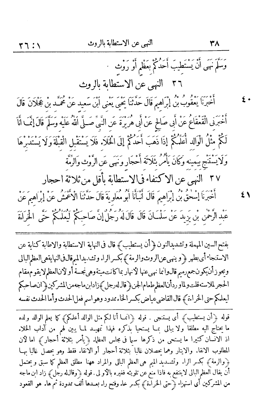 [40] وَيَنْهَى عَنِ الرَّوْثِ وَالرِّمَّةِ بِكَسْرِ الرَّاءِ وَتَشْدِيدِ الْمِيمِ قَالَ فِي النِّهَايَةِ هِيَ الْعَظْمُ الْبَالِي وَيَجُوزُ أَنْ يَكُونَ جَمْعَ رَمِيمٍ قَالَ وَإِنَّمَا نهى عَنْهَا لأنهار بِمَا كَانَتْ مَيْتَةً وَهِيَ نَجِسَةٌ أَوْ لِأَنَّ الْعَظْمَ لَا يَقُومُ مَقَامَ الْحَجَرِ لِمَلَاسَتِهِ قُلْتُ وَلِمَا ورد أَن الْعظم طَعَام الْجِنّ