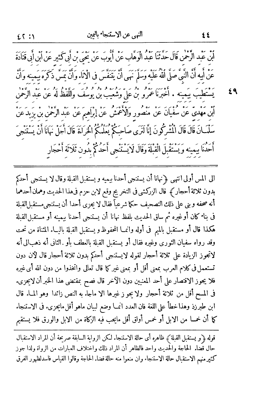 [49] نَهَانَا أَنْ يَسْتَنْجِيَ أَحَدُنَا بِيَمِينِهِ وَيَسْتَقْبِلَ الْقِبْلَةَ وَقَالَ لَا يَسْتَنْجِي أَحَدُكُمْ بِدُونِ ثَلَاثَةِ أَحْجَارٍ قَالَ الزَّرْكَشِيُّ فِي التَّخْرِيجِ وَقَعَ لِابْنِ حَزْمٍ فِي هَذَا الْحَدِيثِ وَهْمَانِ أَحَدُهُمَا أَنَّهُ صَحَّفَهُ وَبَنَى عَلَى ذَلِكَ التَّصْحِيفِ حُكْمًا شَرْعِيًّا فَقَالَ لَا يَجْزِي أَحَدًا أَنْ يَسْتَنْجِيَ مُسْتَقْبِلَ الْقِبْلَةِ فِي بِنَاءٍ كَانَ أَوْ غَيْرِهِ ثُمَّ سَاقَ الْحَدِيثَ بِلَفْظِ نَهَانَا أَنْ يَسْتَنْجِيَ أَحَدُنَا بِيَمِينِهِ أَوْ مُسْتَقْبِلَ الْقِبْلَةِ هَكَذَا قَالَ أَوْ مُسْتَقْبِلَ بِالْمِيمِ فِي أَوَّلِهِ وَإِنَّمَا الْمَحْفُوظُ وَيَسْتَقْبِلَ الْقِبْلَةَ بِالْيَاءِ الْمُثَنَّاةِ مِنْ تَحْتٍ وَقَدْ رَوَاهُ سُفْيَانُ الثَّوْرِيُّ وَغَيْرُهُ فَقَالَ أَوْ يَسْتَقْبِلَ الْقِبْلَةَ بِالْعَطْفِ بِأَوْ الثَّانِي أَنَّهُ ذَهَبَ إِلَى أَنَّهُ لَا تَجُوزُ الزِّيَادَةُ عَلَى ثَلَاثَةِ أَحْجَارٍ لِقَوْلِهِ لَا يَسْتَنْجِي أَحَدُكُمْ بِدُونِ ثَلَاثَةِ أَحْجَارٍ قَالَ لِأَنَّ دُونَ تُسْتَعْمَلُ فِي كَلَامِ الْعَرَبِ بِمَعْنَى أَقَلَّ أَوْ بِمَعْنَى غَيْرَ كَمَا قَالَ تَعَالَى وَاتَّخَذُوا من دون الله أَيْ غَيْرَهُ فَلَا يَجُوزُ الِاقْتِصَارُ عَلَى أَحَدِ الْمَعْنَيَيْنِ دُونَ الْآخَرِ قَالَ فَصَحَّ بِمُقْتَضَى هَذَا الْخَبَرِ أَنْ لَا يُجْزِئَ فِي الْمَسْحِ أَقَلُّ مِنْ ثَلَاثَةِ أَحْجَارٍ وَلَا يَجُوزُ غَيْرُهَا إِلَّا مَا جَاءَ بِهِ النَّصُّ زَائِدًا وَهُوَ الْمَاءُ قَالَ بن طبرزذ وَهَذَا خَطَأٌ عَلَى اللُّغَةِ فَإِنَّ الْعَدَدَ إِنَّمَا وُضِعَ لِبَيَانِ مَا هُوَ أَقَلُّ مَا يُجْزِئُ فِي الِاسْتِنْجَاءِ كَمَا أَنَّ خَمْسًا مِنَ الْإِبِلِ أَوْ خَمْسَ أَوَاقٍ أَقَلُّ مَا يَجِبُ فِيهِ الزَّكَاةُ مِنَ الْإِبِلِ وَالْوَرِقِ فَلَا يَسْتَقِيمُ