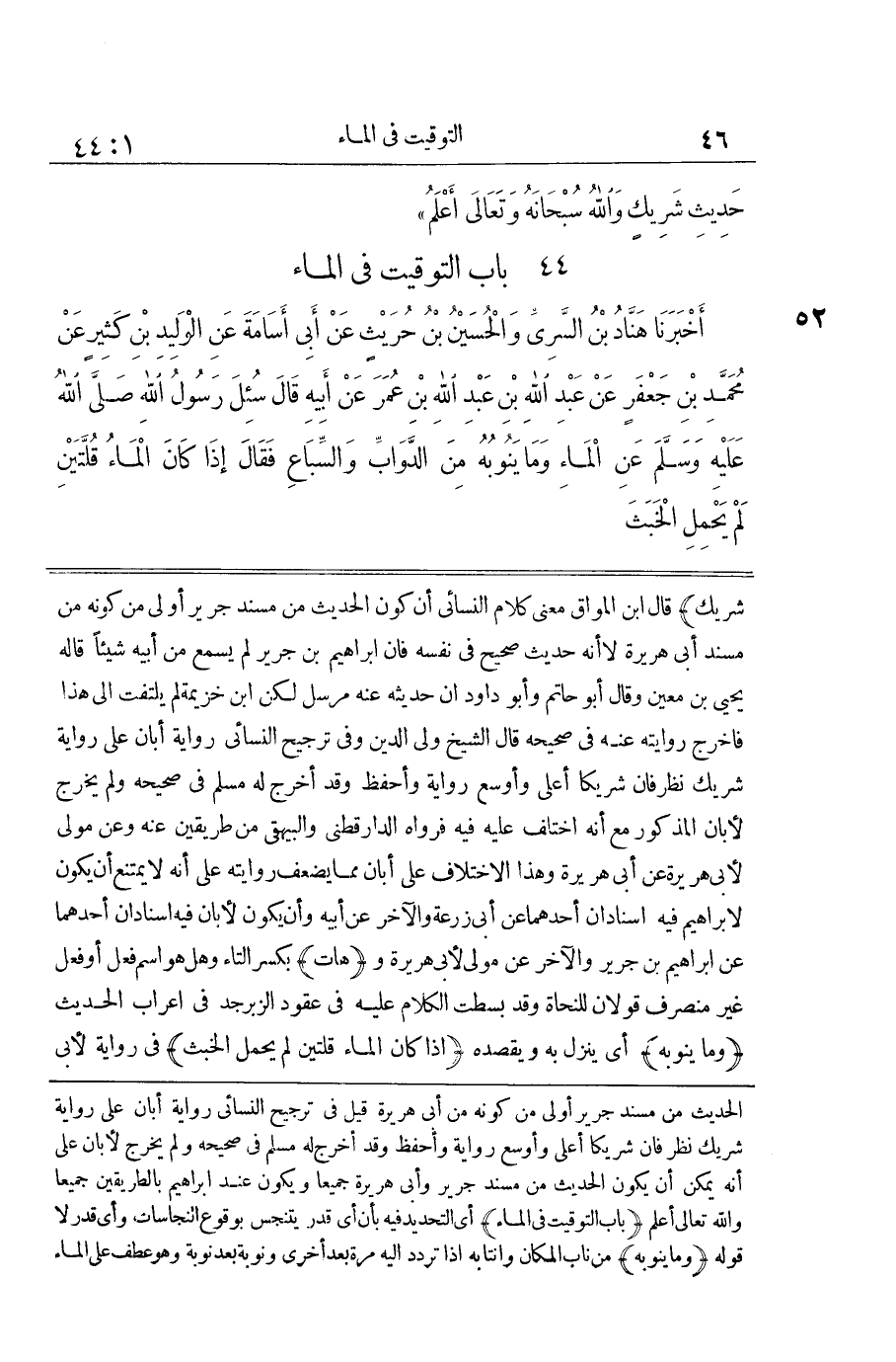 شريك قَالَ بن الْمَوَّاقِ مَعْنَى كَلَامِ النَّسَائِيِّ أَنَّ كَوْنَ الْحَدِيثِ مِنْ مُسْنَدِ جَرِيرٍ أَوْلَى مِنْ كَوْنِهِ مِنْ مُسْنَدِ أَبِي هُرَيْرَةَ لَا أَنَّهُ حَدِيثٌ صَحِيحٌ فِي نَفْسِهِ فَإِنَّ إِبْرَاهِيمَ بْنَ جَرِيرٍ لَمْ يَسْمَعْ مِنْ أَبِيهِ شَيْئًا قَالَهُ يَحْيَى بْنُ مَعِينٍ وَقَالَ أَبُو حَاتِمٍ وَأَبُو دَاوُدَ إِنَّ حَدِيثه عَنهُ مُرْسل لَكِن بن خُزَيْمَةَ لَمْ يَلْتَفِتْ إِلَى هَذَا فَأَخْرَجَ رِوَايَتَهُ عَنْهُ فِي صَحِيحِهِ قَالَ الشَّيْخُ وَلِيُّ الدِّينِ وَفِي تَرْجِيحِ النَّسَائِيِّ رِوَايَةَ أَبَانٍ عَلَى رِوَايَةِ شَرِيكٍ نَظَرٌ فَإِنَّ شَرِيكًا أَعْلَى وَأَوْسَعُ رِوَايَةً وَأَحْفَظُ وَقَدْ أَخْرَجَ لَهُ مُسْلِمٌ فِي صَحِيحِهِ وَلَمْ يُخْرِجْ لِأَبَانٍ الْمَذْكُورِ مَعَ أَنَّهُ اُخْتُلِفَ عَلَيْهِ فِيهِ فَرَوَاهُ الدَّارَقُطْنِيُّ وَالْبَيْهَقِيُّ مِنْ طَرِيقَيْنِ عَنْهُ وَعَنْ مَوْلَى لِأَبِي هُرَيْرَةَ عَنْ أَبِي هُرَيْرَةَ وَهَذَا الِاخْتِلَافُ عَلَى أَبَانٍ مِمَّا يُضْعِفُ رِوَايَتَهُ عَلَى أَنَّهُ لَا يَمْتَنِعُ أَنْ يَكُونَ لِإِبْرَاهِيمَ فِيهِ إِسْنَادَانِ أَحَدُهُمَا عَنْ أَبِي زُرْعَةَ وَالْآخَرُ عَنْ أَبِيهِ وَأَنْ يَكُونَ لِأَبَانٍ فِيهِ إِسْنَادَانِ أَحَدُهُمَا عَنْ إِبْرَاهِيمَ بْنِ جَرِيرٍ وَالْآخَرُ عَن مولى لأبي هُرَيْرَة وهات بِكَسْرِ التَّاءِ وَهَلْ هُوَ اسْمُ فِعْلٍ أَوْ فِعْلٌ غَيْرُ مُنْصَرِفٍ قَوْلَانِ لِلنُّحَاةِ وَقَدْ بَسَطْتُ الْكَلَامَ عَلَيْهِ فِي عُقُودِ الزَّبَرْجَدِ فِي إِعْرَابِ الحَدِيث