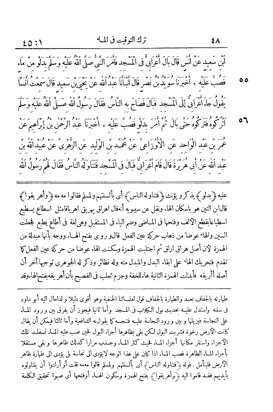 [56] فَتَنَاوَلَهُ النَّاسُ أَيْ بِأَلْسِنَتِهِمْ وَلِمُسْلِمٍ فَقَالُوا مَهْ مَه وأهريقوا قَالَ بن التِّينِ هُوَ بِإِسْكَانِ الْهَاءِ وَنَقَلَ عَنْ سِيبَوَيْهِ أَنَّهُ قَالَ أَهْرَاقَ يُهْرِيقُ إِهْرِيَاقًا مِثْلُ اسْطَاعَ يسطيع اسطياعا بِقَطْعِ الْأَلِفِ وَفَتْحِهَّا فِي الْمَاضِي وَضَمِّ الْيَاءِ فِي الْمُسْتَقْبَلِ وَهِيَ لُغَةٌ فِي أَطَاعَ يُطِيعُ فَجُعِلَتِ السِّينُ وَالْهَاءُ عِوَضًا مِنْ ذَهَابِ حَرَكَةِ عَيْنِ الْفِعْلِ قَالَ وَرُوِيَ بِفَتْحِ الْهَاءِ وَوُجِّهَ بِأَنَّهَا مُبْدَلَةٌ مِنَ الْهَمْزَةِ لِأَنَّ أَصْلَ هَرَاقَ أَرَاقَ ثُمَّ اُجْتُلِبَتِ الْهَمْزَةُ وَسُكِّنَتِ الْهَاءُ عِوَضًا مِنْ حَرَكَةِ عَيْنِ الْفِعْلِ كَمَا تَقَدَّمَ فَتَحْرِيكُ الْهَاءِ عَلَى إِبْقَاءِ الْبَدَلِ وَالْمُبْدَلِ مِنْهُ وَلَهُ نَظَائِرٌ وَذَكَرَ لَهُ الْجَوْهَرِيُّ تَوْجِيهًا آخَرَ أَنَّ أَصْلَهُ أَأْرِيقُهُ فَأُبْدِلَتِ الْهَمْزَةُ الثَّانِيَةُ هَاءً لِلْخِفَّةِ وَجَزَمَ ثَعْلَبُ فِي الْفَصِيحِ بِأَنَّ أَهَرِيقُهُ بِفَتْحِ الْهَاء وَقد