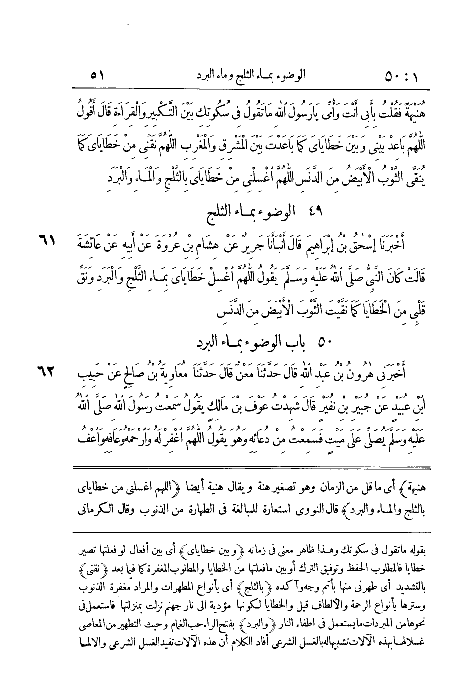 هُنَيْهَةً أَيْ مَا قَلَّ مِنَ الزَّمَانِ وَهُوَ تَصْغِيرُ هَنَةٍ وَيُقَالُ هُنَيَّةٌ أَيْضًا اللَّهُمَّ اغْسِلْنِي مِنْ خَطَايَايَ بِالثَّلْجِ وَالْمَاءِ وَالْبَرَدِ قَالَ النَّوَوِيُّ اسْتِعَارَةٌ لِلْمُبَالَغَةِ فِي الطَّهَارَةِ مِنَ الذُّنُوبِ وَقَالَ الْكرْمَانِي