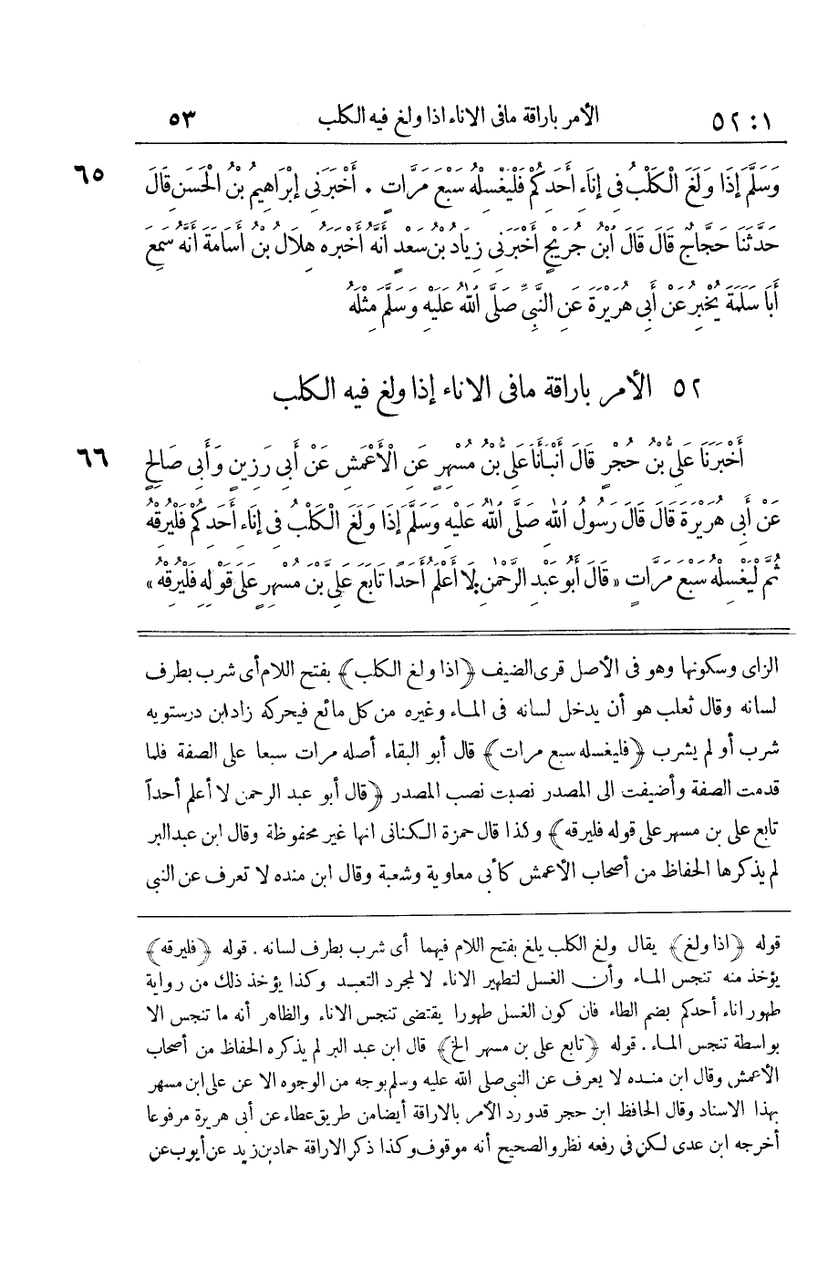[64] إِذَا وَلَغَ الْكَلْبُ بِفَتْحِ اللَّامِ أَيْ شَرِبَ بِطَرَفِ لِسَانِهِ وَقَالَ ثَعْلَبُ هُوَ أَنْ يُدْخِلَ لِسَانَهُ فِي الْمَاءِ وَغَيْرِهِ مِنْ كُلِّ مَائِعٍ فيحركه زَاد بن دَرَسْتَوَيْهِ شَرِبَ أَوْ لَمْ يَشْرَبْ فَلْيَغْسِلْهُ سَبْعَ مَرَّاتٍ قَالَ أَبُو الْبَقَاءِ أَصْلُهُ مَرَّاتٍ سَبْعًا عَلَى الصِّفَةِ فَلَمَّا قُدِّمَتِ الصِّفَةُ وَأُضِيفَتْ إِلَى الْمصدر نصبت نصب الْمصدر