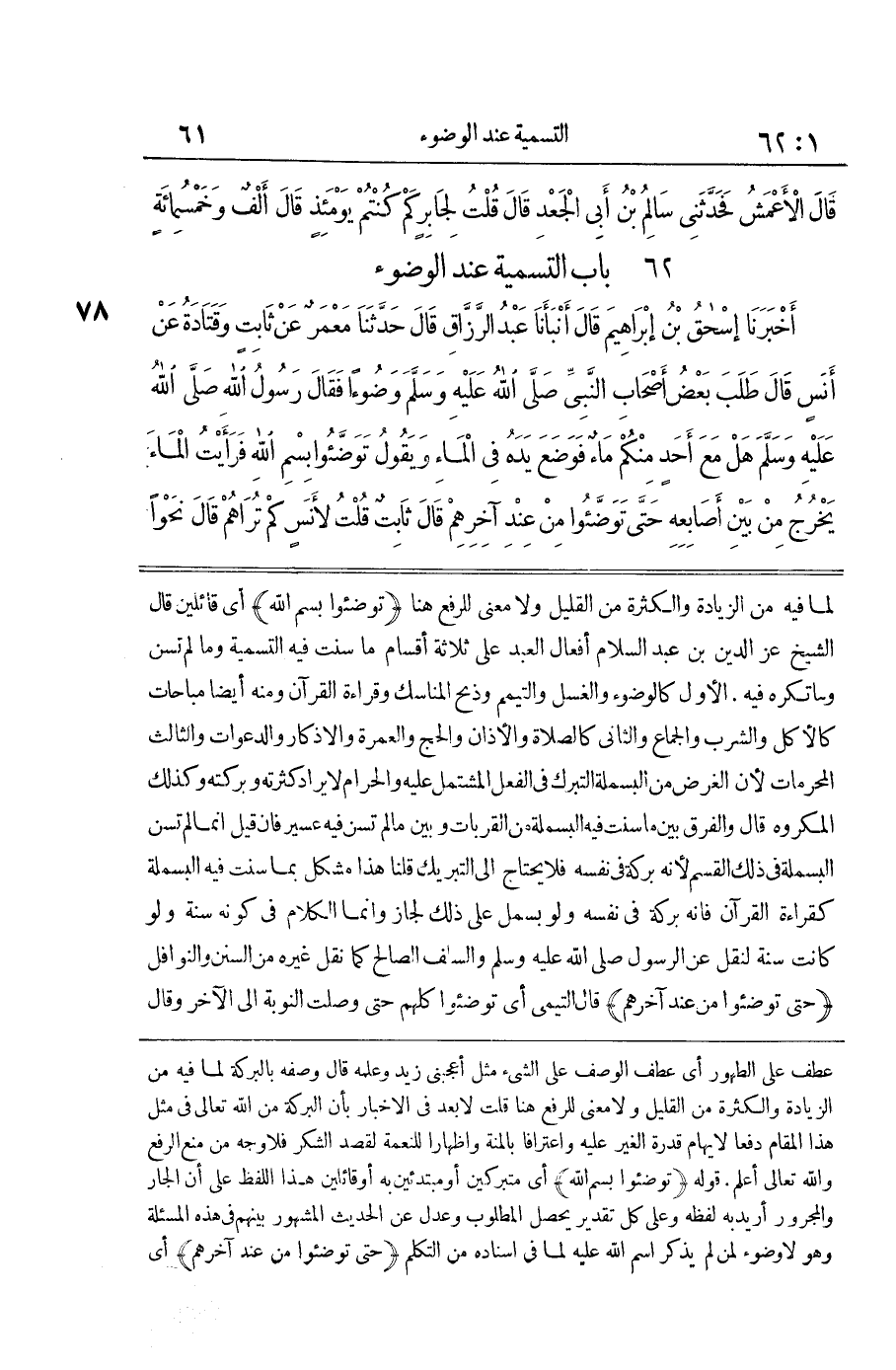 [78] تَوَضَّئُوا بِسْمِ اللَّهِ أَيْ قَائِلِينَ قَالَ الشَّيْخُ عِزُّ الدِّينِ بْنُ عَبْدِ السَّلَامِ أَفْعَالُ الْعَبْدِ عَلَى ثَلَاثَةِ أَقْسَامٍ مَا سُنَّتْ فِيهِ التَّسْمِيَةُ وَمَا لَمْ تُسَنْ وَمَا تُكْرَهُ فِيهِ الْأَوَّلُ كَالْوُضُوءِ وَالْغُسْلِ وَالتَّيَمُّمِ وَذَبْحِ الْمَنَاسِكِ وَقِرَاءَةِ الْقُرْآنِ وَمِنْهُ أَيْضًا مُبَاحَاتٌ كَالْأَكْلِ وَالشُّرْبِ وَالْجِمَاعِ وَالثَّانِي كَالصَّلَاةِ وَالْأَذَانِ وَالْحَجِّ وَالْعُمْرَةِ وَالْأَذْكَارِ وَالدَّعَوَاتِ وَالثَّالِثُ الْمُحَرَّمَاتُ لِأَنَّ الْغَرَضَ مِنَ الْبَسْمَلَةِ التَّبَرُّكُ فِي الْفِعْلِ الْمُشْتَمِلِ عَلَيْهِ وَالْحَرَامُ لَا يُرَادُ كَثْرَتُهُ وَبَرَكَتُهُ وَكَذَلِكَ الْمَكْرُوهُ قَالَ وَالْفَرْقُ بَيْنَ مَا سُنَّتْ فِيهِ الْبَسْمَلَةُ مِنَ الْقُرُبَاتِ وَبَيْنَ مَا لَمْ تُسَنْ فِيهِ عَسِيرٌ فَإِنْ قِيلَ إِنَّمَا لَمْ تُسَنِ الْبَسْمَلَةُ فِي ذَلِكَ الْقِسْمِ لِأَنَّهُ بَرَكَةٌ فِي نَفْسِهِ فَلَا يَحْتَاجُ إِلَى التَّبْرِيكِ قُلْنَا هَذَا مُشْكِلٌ بِمَا سُنَّتْ فِيهِ الْبَسْمَلَةُ كَقِرَاءَةِ الْقُرْآنِ فَإِنَّهُ بَرَكَةٌ فِي نَفْسِهِ وَلَوْ بَسْمَلَ عَلَى ذَلِكَ لَجَازَ وَإِنَّمَا الْكَلَامُ فِي كَوْنِهِ سُنَّةً وَلَوْ كَانَتْ سُنَّةً لَنُقِلَ عَنِ الرَّسُولِ صَلَّى اللَّهُ عَلَيْهِ وَسَلَّمَ وَالسَّلَفِ الصَّالِحِ كَمَا نُقِلَ غَيْرُهُ مِنَ السُّنَنِ وَالنَّوَافِلِ حَتَّى تَوَضَّئُوا مِنْ عِنْدَ آخِرِهِمْ قَالَ التَّيْمِيُّ أَيْ تَوَضَّئُوا كُلُّهُمْ حَتَّى وَصَلَتِ النَّوْبَةُ إِلَى الْآخِرِ وَقَالَ