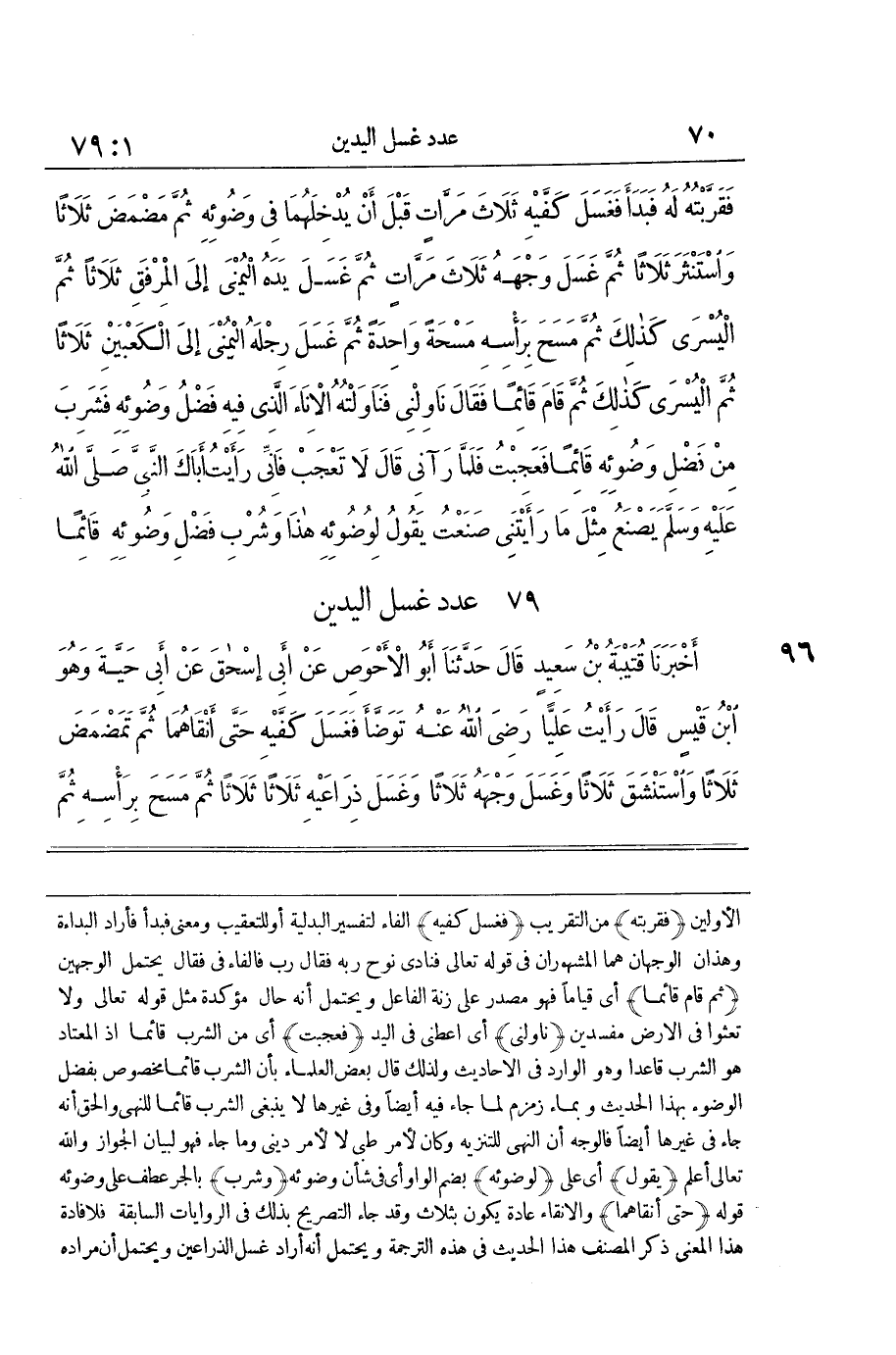 [96] حَتَّى أنقاهما والانقاء عَادَة يكون بِثَلَاث وَقد جَاءَ التَّصْرِيح بذلك فِي الرِّوَايَات السَّابِقَة فَلَا فادة هَذَا الْمَعْنى ذكر المُصَنّف هَذَا الحَدِيث فِي هَذِه التَّرْجَمَة وَيحْتَمل أَنه أَرَادَ غسل الذراعين وَيحْتَمل أَن مُرَاده التَّنْبِيه على أَن الْمَقْصُود الانقاء دون التَّثْلِيث وَهَذَا بعيد مُخَالف لقواعد الْأُصُول لوُجُوب حمل الْمُجْمل على الْمفصل وأقوال الْفُقَهَاء وَالله تَعَالَى أعلم