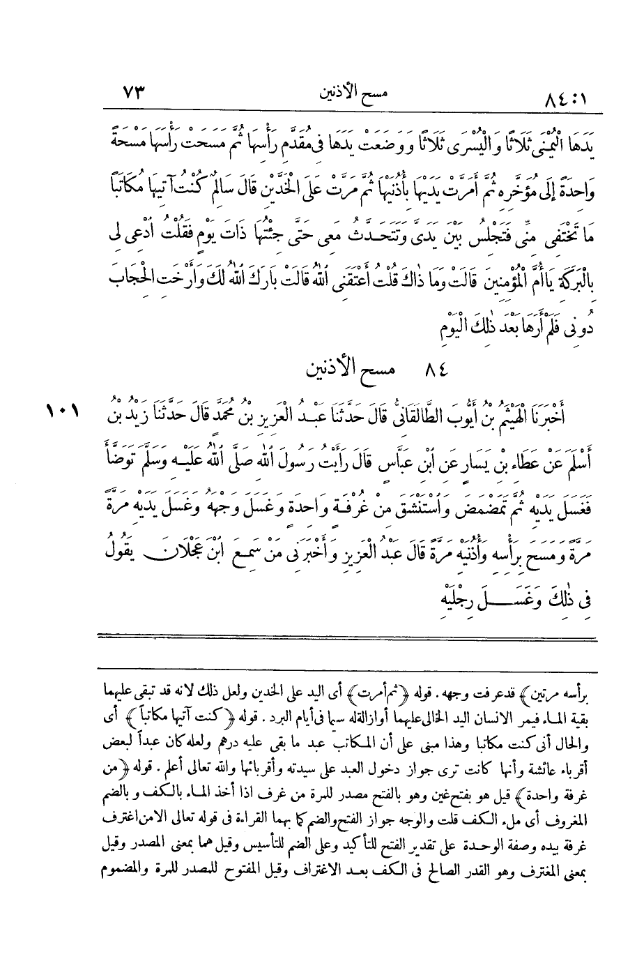 [101] من غرفَة وَاحِدَة قيل هُوَ بِفَتْح غين وَهُوَ بِالْفَتْح مصدر للمرة من غرف إِذا أَخذ المَاء بالكف وبالضم المغروف أَي ملْء الْكَفّ قلت وَالْوَجْه جَوَاز الْفَتْح وَالضَّم كَمَا بهما الْقِرَاءَة فِي قَوْله تَعَالَى الا من اغترف غرفَة بِيَدِهِ وَصفَة الْوحدَة على تَقْدِير الْفَتْح للتَّأْكِيد وعَلى الضَّم للتأسيس وَقيل هما بِمَعْنى الْمصدر وَقيل بِمَعْنى المغترف وَهُوَ الْقدر الصَّالح فِي الْكَفّ بعد الاغتراف وَقيل المفتوح للمصدر للمرة والمضموم اسْم للقدر الْحَاصِل فِي الْكَفّ بالاغتراف وَالله تَعَالَى أعلم قَوْله بالسباحتين السَّبَّاحَةُ وَالْمُسَبِّحَةُ الْأُصْبُعُ الَّتِي تَلِي الْإِبْهَامَ سُمِّيَتْ بذلك لِأَنَّهَا يشار بهَا عِنْد التَّسْبِيح وَهَذَا اسْم إسلامي وضعوها مَكَان السبابَة لما فِيهِ من الدّلَالَة على الْمَعْنى الْمَكْرُوه قَوْله