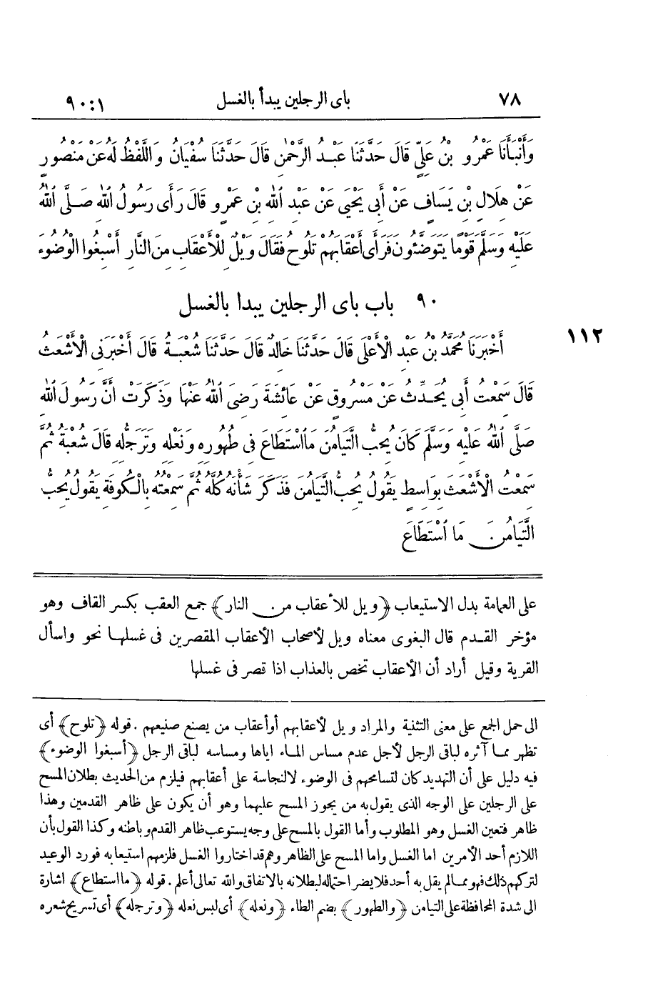 [111] وَيْلٌ لِلْأَعْقَابِ مِنَ النَّارِ جَمْعُ الْعَقِبِ بِكَسْرِ الْقَافِ وَهُوَ مُؤَخَّرُ الْقَدَمِ قَالَ الْبَغَوِيُّ مَعْنَاهُ وَيْلٌ لِأَصْحَابِ الْأَعْقَابِ الْمُقَصِّرِينَ فِي غَسْلِهَا نَحْوَ واسأل الْقرْيَة وَقِيلَ أَرَادَ أَنَّ الْأَعْقَابَ تُخَصُّ بِالْعَذَابِ إِذَا قصر فِي غسلهَا