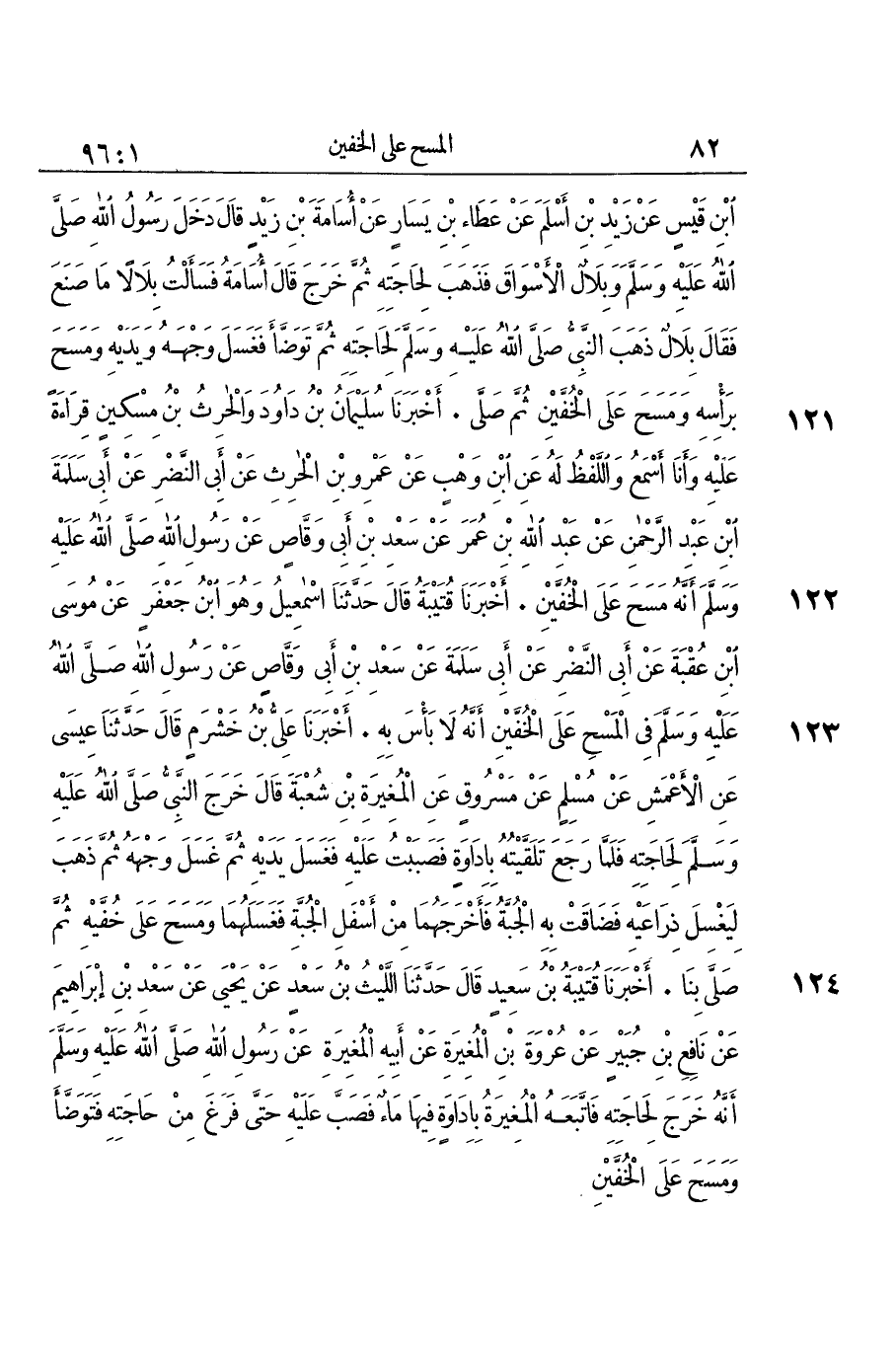 124 - أَخْبَرَنَا قُتَيْبَةُ بْنُ سَعِيدٍ قَالَ: حَدَّثَنَا اللَّيْثُ بْنُ سَعْدٍ، عَنْ يَحْيَى، عَنْ سَعْدِ بْنِ إِبْرَاهِيمَ، عَنْ نَافِعِ بْنِ جُبَيْرٍ، عَنْ عُرْوَةَ بْنِ الْمُغِيرَةِ، عَنْ أَبِيهِ الْمُغِيرَةِ، عَنْ رَسُولِ اللَّهِ صَلَّى اللهُ عَلَيْهِ وَسَلَّمَ: «أَنَّهُ خَرَجَ لِحَاجَتِهِ، فَاتَّبَعَهُ الْمُغِيرَةُ بِإِدَاوَةٍ فِيهَا مَاءٌ، فَصَبَّ عَلَيْهِ حَتَّى فَرَغَ مِنْ حَاجَتِهِ، §فَتَوَضَّأَ وَمَسَحَ عَلَى الْخُفَّيْنِ»