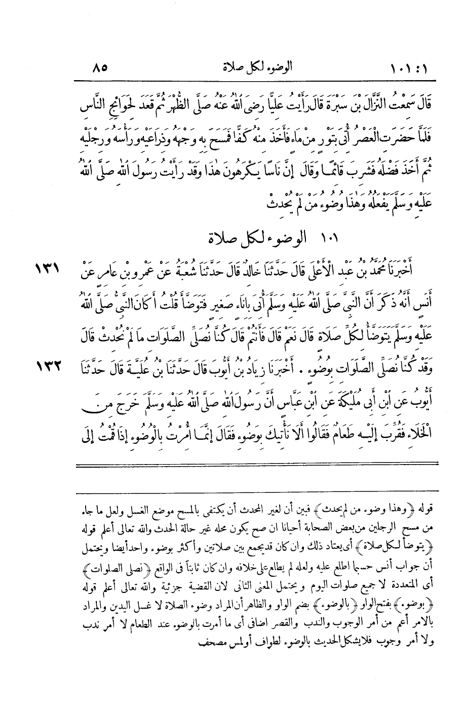 [131] يتَوَضَّأ لكل صَلَاة أَي يعْتَاد ذَلِك وان كَانَ قد يجمع بَين صَلَاتَيْنِ وَأكْثر بِوضُوء وَاحِد أَيْضا وَيحْتَمل أَن جَوَاب أنس حَسْبَمَا اطلع عَلَيْهِ وَلَعَلَّه لم يطلع على خِلَافه وان كَانَ ثَابتا فِي الْوَاقِع نصلي الصَّلَوَات أَي المتعددة لَا جَمِيع صلوَات الْيَوْم وَيحْتَمل الْمَعْنى الثَّانِي لِأَن الْقَضِيَّة جزئية وَالله تَعَالَى أعلم قَوْله بِوضُوء بِفَتْح الْوَاو بِالْوضُوءِ بِضَم الْوَاو وَالظَّاهِر أَن المُرَاد وضوء الصَّلَاة لَا غسل الْيَدَيْنِ وَالْمرَاد بِالْأَمر أَعم من أَمر الْوُجُوب وَالنَّدْب وَالْقصر اضافي أَي مَا أمرت بِالْوضُوءِ عِنْد الطَّعَام لَا أَمر ندب وَلَا أَمر وجوب فَلَا يشكل الحَدِيث بِالْوضُوءِ لطواف أَو لمس مصحف