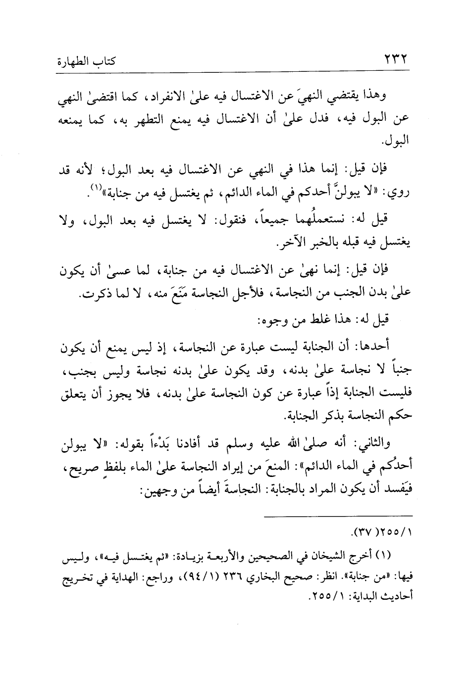 والثاني: أنه صلى الله عليه وسلم قد أفادنا بدءًا بقوله: "لا يبولن أحدكم في الماء الدائم": المنع من إيراد النجاسة على الماء بلفظ صريح فيفسد أن يكون المراد بالجنابة: النجاسة أيضًا من وجهين:
