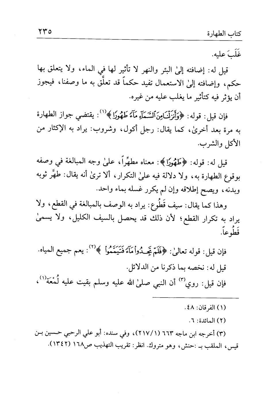 فإن قيل: قوله:} وأنزلنا من السماء ماء طهورًا {: يقتضي جواز الطهارة به مرة بعد أخرى، كما يقال: رجل أكول، وشروب: يراد به الإكثار من الأكل والشرب.