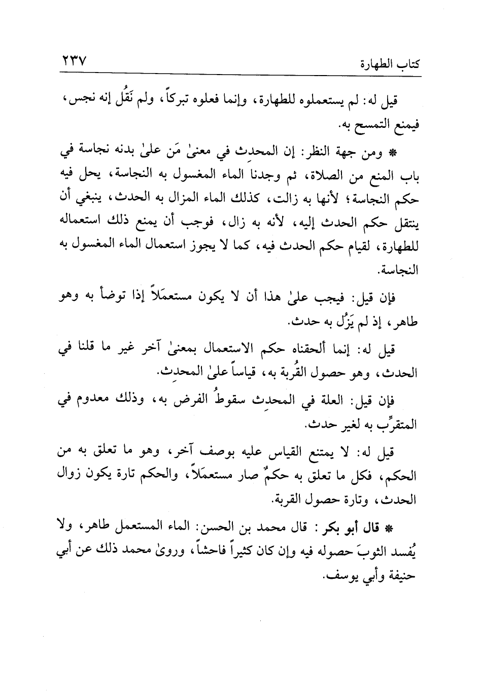 * ومن وجهة النظر: إن المحدث في معنى من على بدنه نجاسة في باب المنع من الصلاة، ثم وجدنا الماء المغسول به النجاسة، يحل في حكم النجاسة؛ لأنها به زالت، كذلك الماء المزال به الحدث، ينبغي أن ينتقل حكم الحدث إليه، لأنه به زال، فوجب أن يمنع ذلك استعماله للطهارة، لقيام حكم الحدث فيه، كما لا يجوز استعمال الماء المغسول به النجاسة.