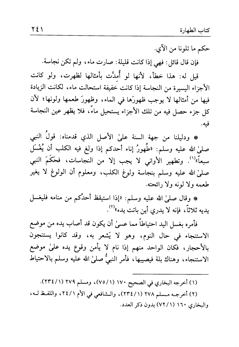 * ودليلنا من جهة السنة على الأصل الذي قدمناه: قول النبي صلى الله عليه وسلم: "طهور إناء أحدكم إذا ولغ فيه الكلب أن يغسل سبعًا" وتطهير الأواني لا يجب إلا من النجاسات، فحكم النبي صلى الله عليه وسلم بنجاسة ولوغ الكلب، ومعلوم أن الولوغ لا يغير طعمه ولا لونه ولا رائحته.