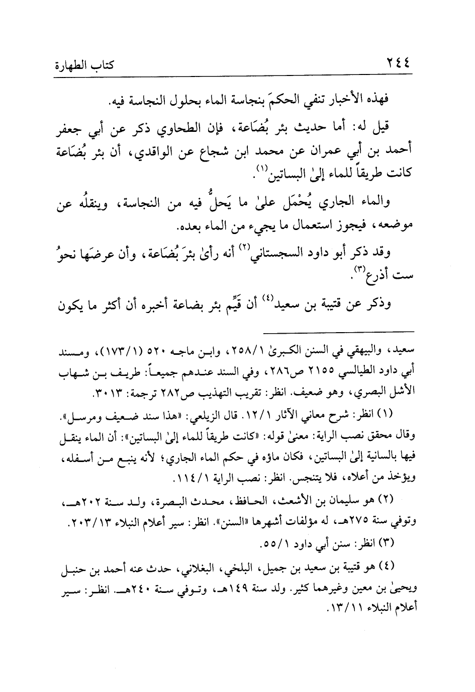 قيل له: أما حديث بئر بضاعة، فإن الطحاوي ذكر عن أبي جعفر أحمد بن أبي عمران عن محمد ابن شجاع عن الواقدي، أن بئر بضاعة كانت طريقًا للماء إلى البساتين.